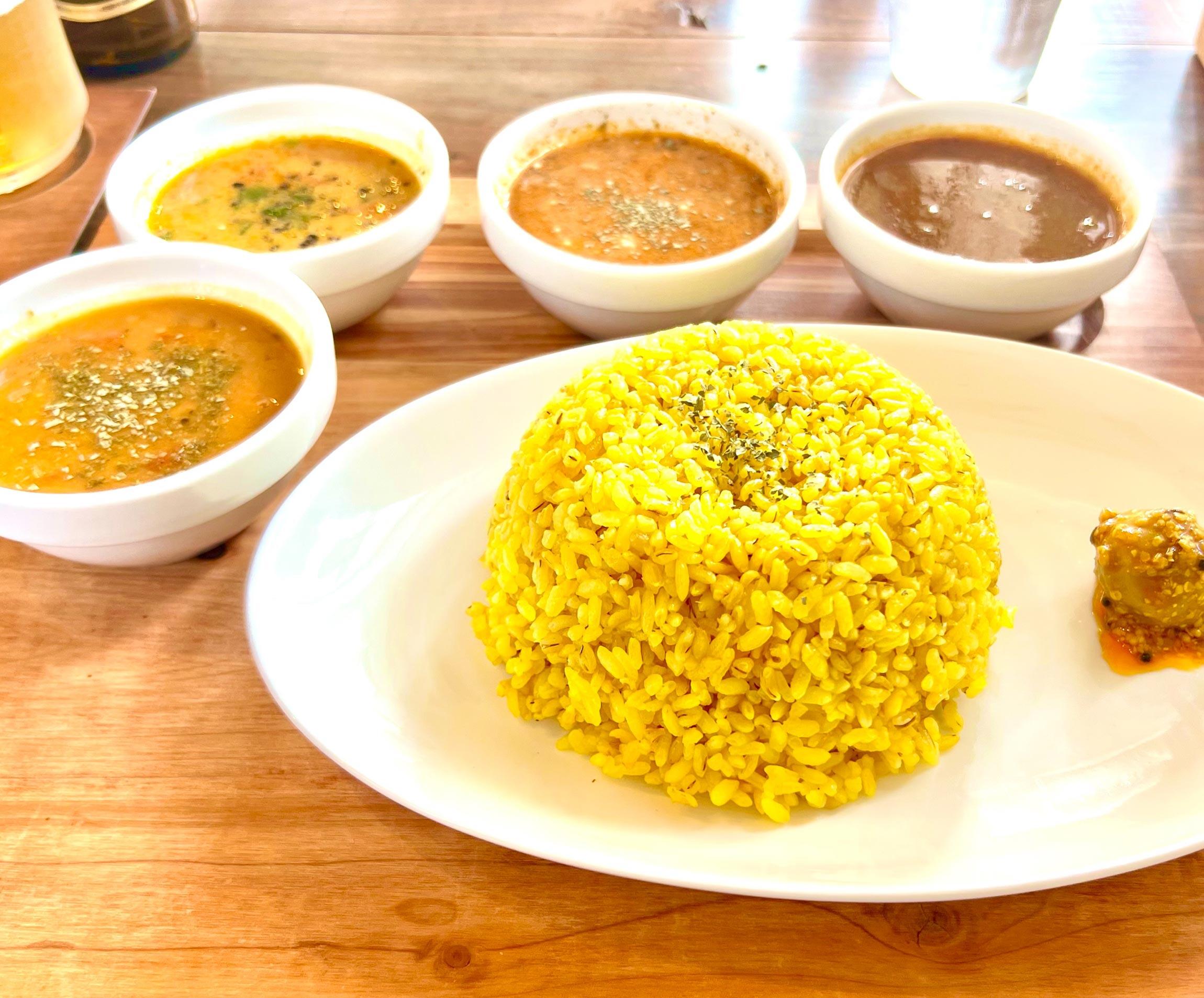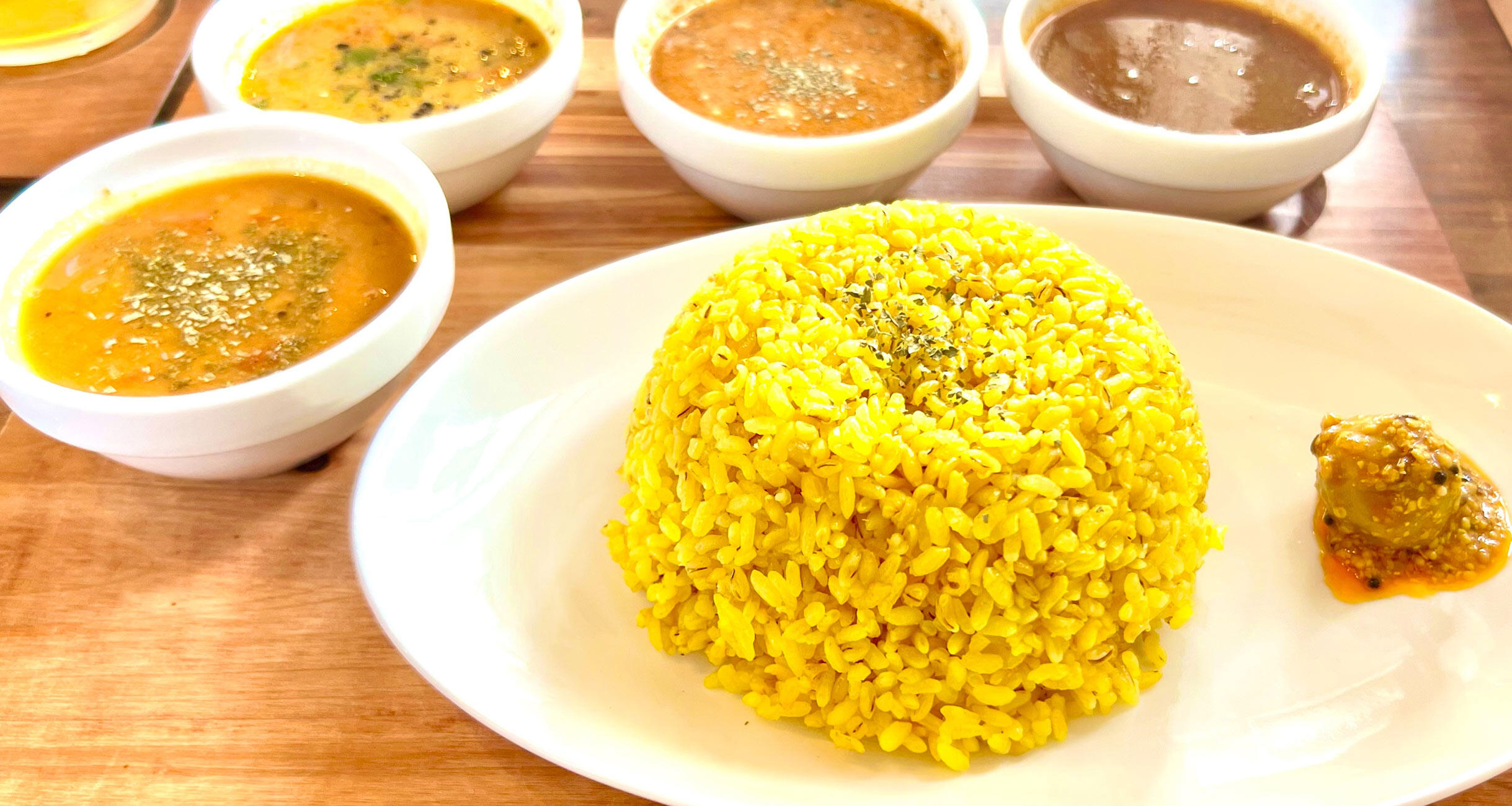 ライスは麦をブレンドしたターメリックライスで、ぱらりとしているのでもたれずどんどん食べられる。その横に添えられた梅干しのアチャールは、タマリンドやレモンピールの酸味に負けない刺激と脇役力を発揮していていい箸休めになる。