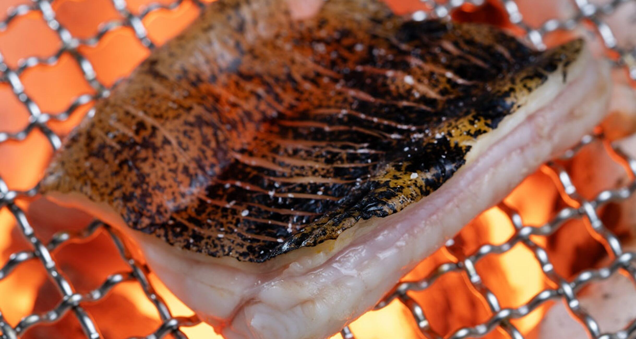 水揚げしたウツボを生きたまま豊洲市場に入荷。非常に生命力が強いから、長旅でも元気いっぱい!そんな活のウツボを斬首して、神経〆にして、血抜き後、背開きにして、内臓と背骨と背びれを処理する。金タワシで皮のぬめりを徹底的に除去し、ナノバブル発生装置の水流で、残った内臓や血を洗い落とす。さらに天日塩の強めの塩水に漬けて身を締め、塩抜き後、4方向から風をあて2時間乾し上げる。尾の部分は骨切りし、さらに1時間乾して干物が完成!囚われの身となった岩礁の王者は、豊洲市場という刑場に移送され、強者たちの手で斬首され、上質な干物に生まれ変わる。