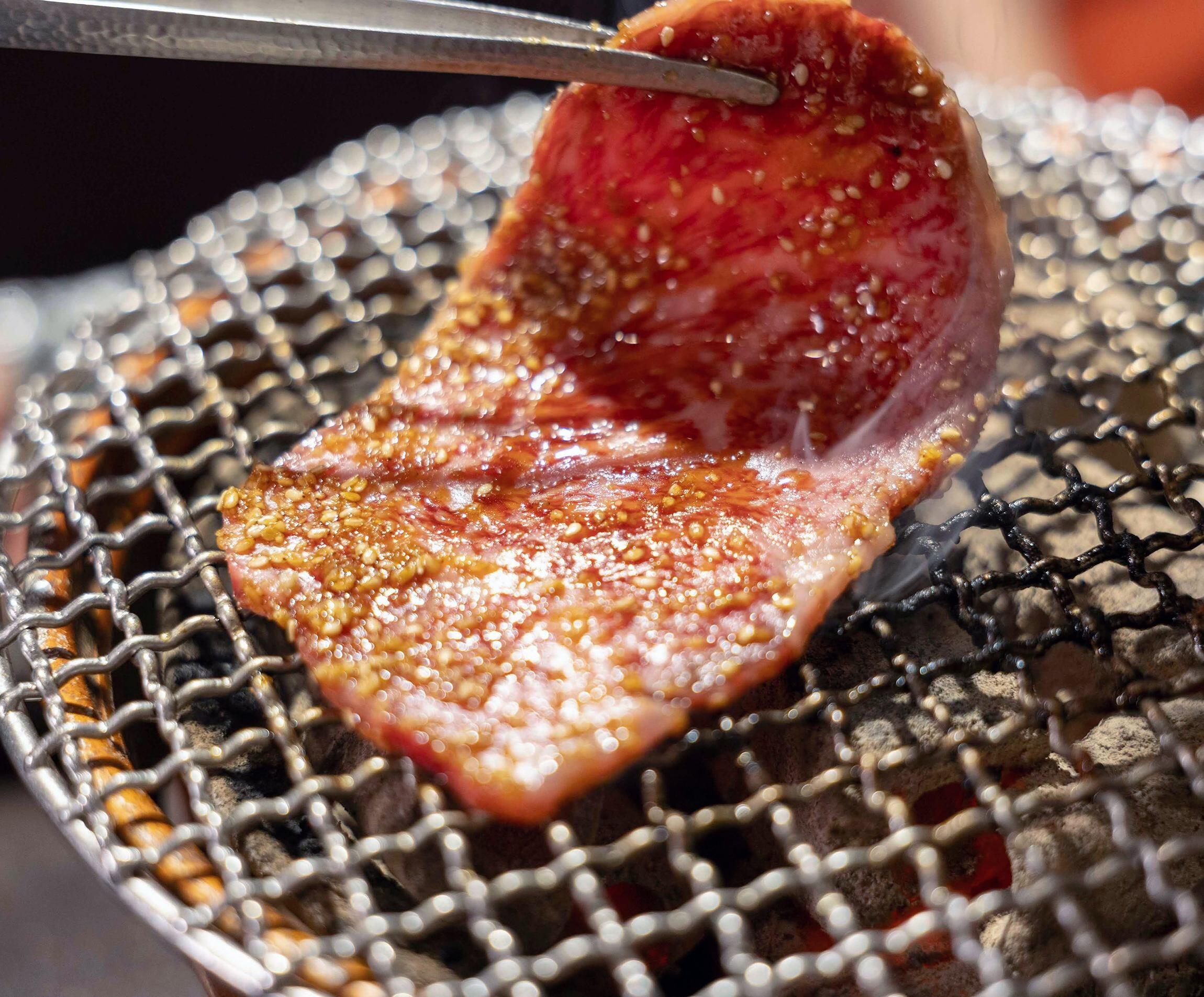 というところで、メニューの先頭に書かれている「幸せの絨毯(じゅうたん)」が現れた。リブロースを切り出したタレ焼肉で、焼き上がりに自家製の和風だしで軽く洗ってフィニッシュとなる品だ。確かにタレでじゃぶじゃぶタイプ。しかしながら、先の言葉とは裏腹に「店の方で焼かせていただきます」と丁寧に焼き上げてくれる。