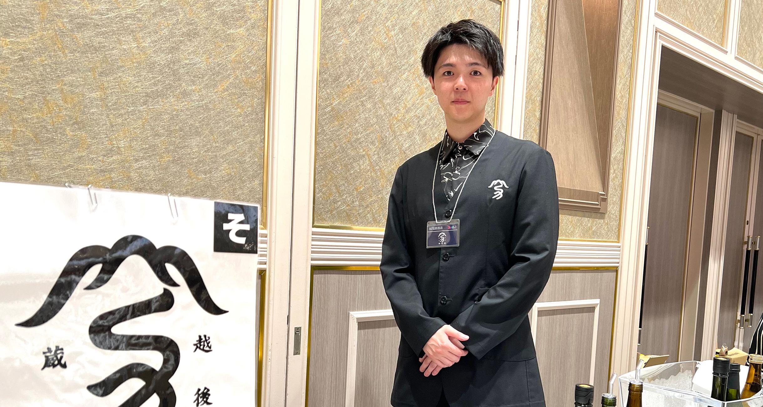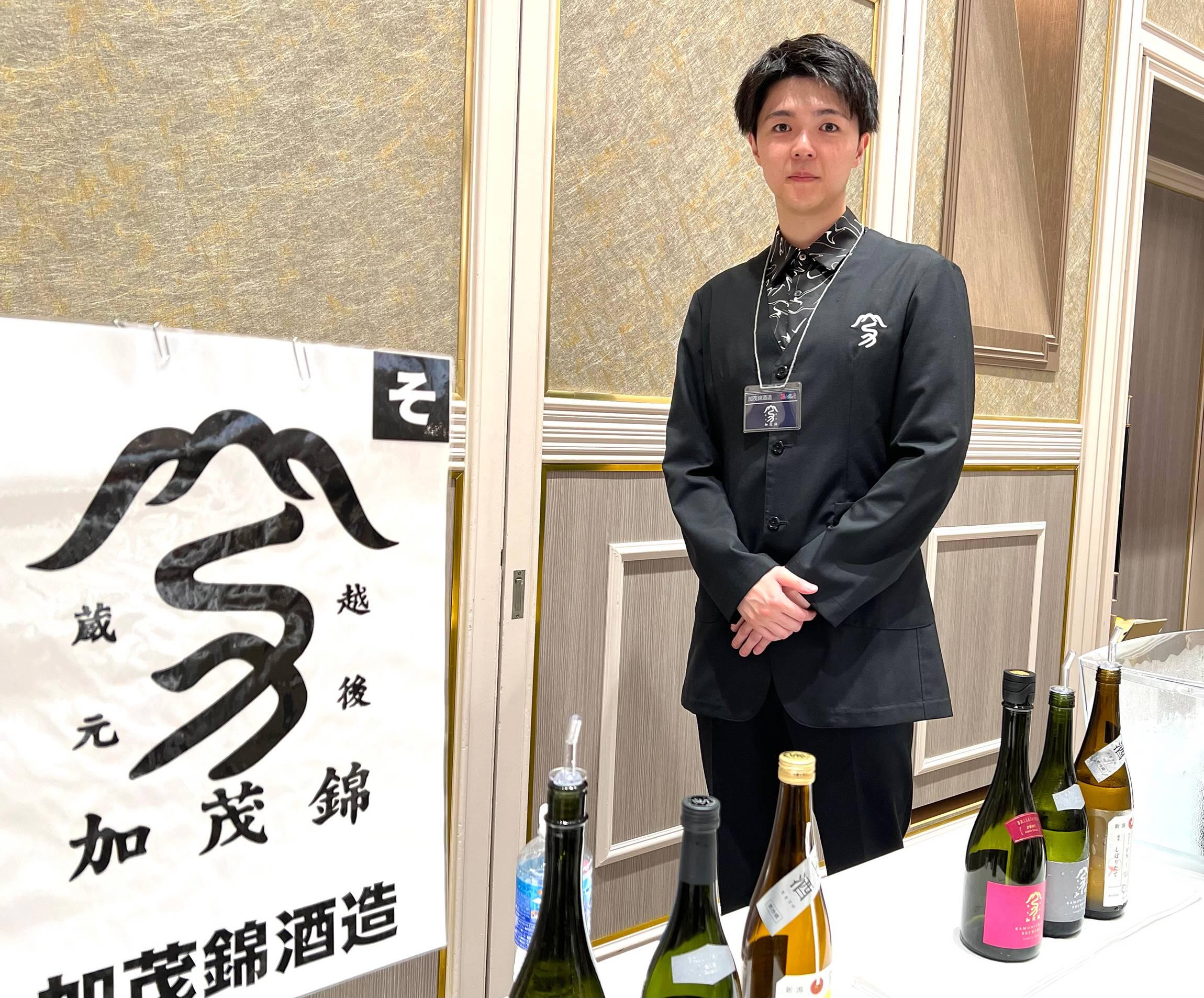 斬新なラベルに惹かれて眺めていると、「お酒、いかがですか?」と、童顔の若者が試飲カップに酒を注いでくれた。すらりと細身で、見上げるほど背が高く(身長185cmとあとで知った)、その上に色白の小さな顔がのっている。どう見ても20代前半の若さだが、言葉遣いはていねいで、浮わついたところがない。