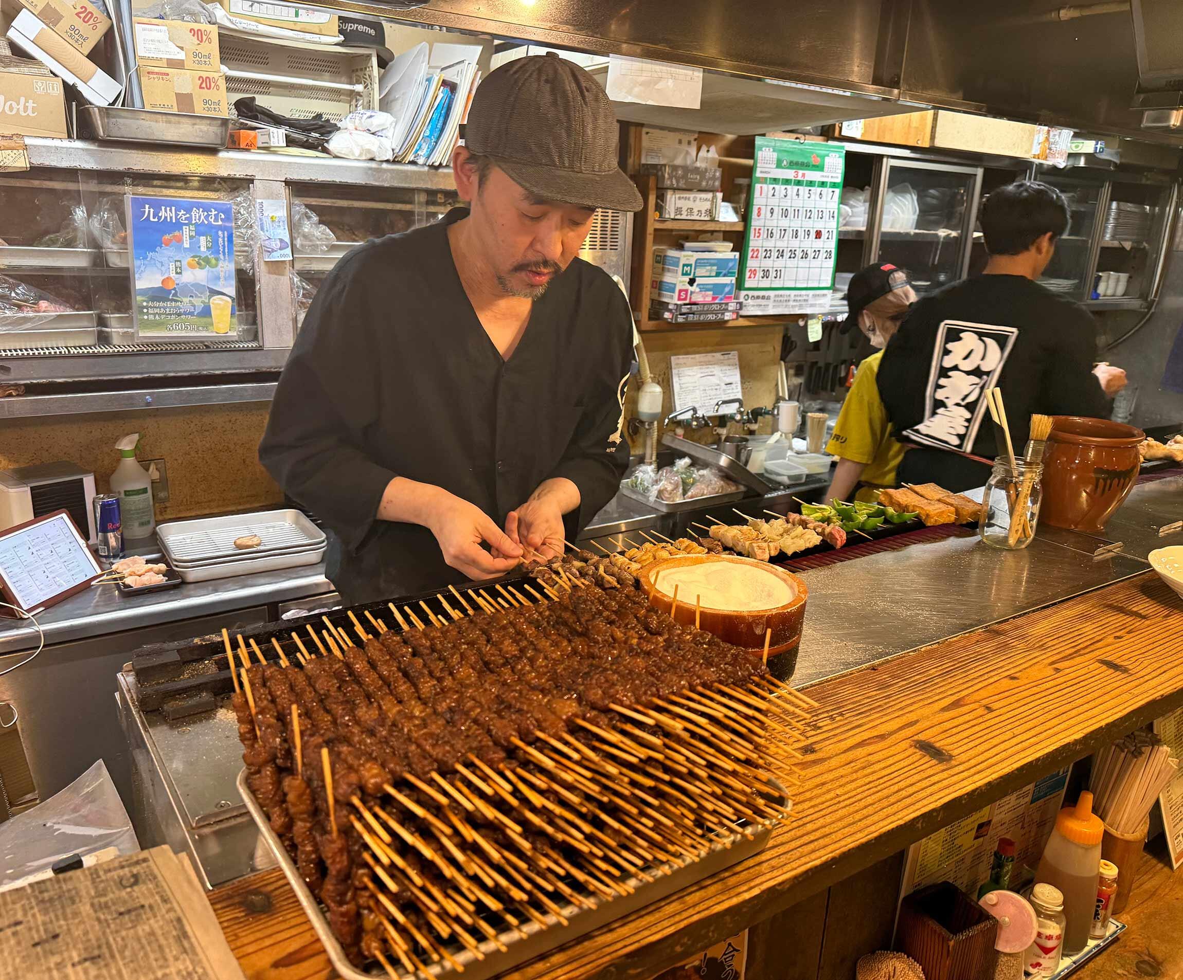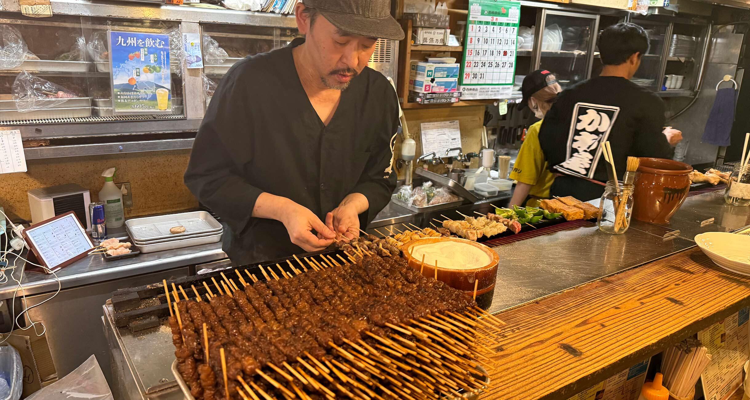 ビール、芋麦米焼酎、ハイボール、ワインなどなど、多数そろう酒類もまた、200円台~500円前後が中心と、古き良き時代に遡ったかのような呑兵衛感涙の設定。加えて例えば焼酎のお湯割りなら、「お湯と焼酎の割合はゴーゴー(5対5)がデフォルト」と太っ腹対応なので、しっかりふくよかに風味が感じられる。旨味が立つ串焼きとの相性も抜群だ。福岡ならねえと興味を引かれた「あまおうサワー」も、おや、まあ、とてもラブリーなおいしさでハートを射ぬかれた。程よい甘酸っぱさが、肉や脂の旨味と絶妙に合うではないか。焼き台に向かって黙々と仕事をこなしつつ、ときにはカウンターからの注文や電話にも対応する、店長・坂本稔さんのマルチタスクぶりも、惚れ惚れしながら酒が進む眺めだ。