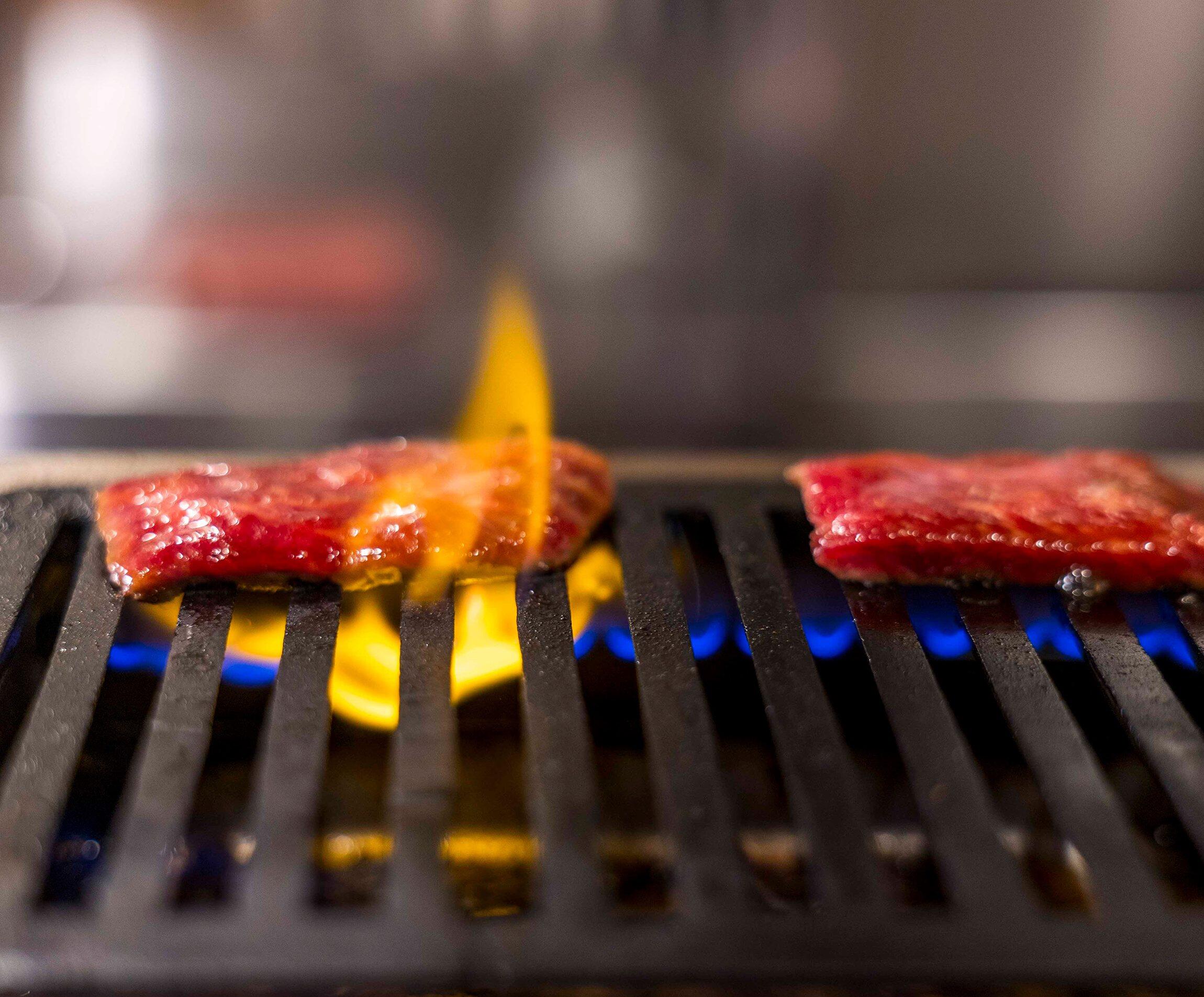 肉は一皿目からすでに違う。「とりあえずタン」ではない。まずは鶏から!それもナンコツなのだ。着座した正面のカウンター上のレーンにロースターが滑り込んできて、ガスホースがつながれる。