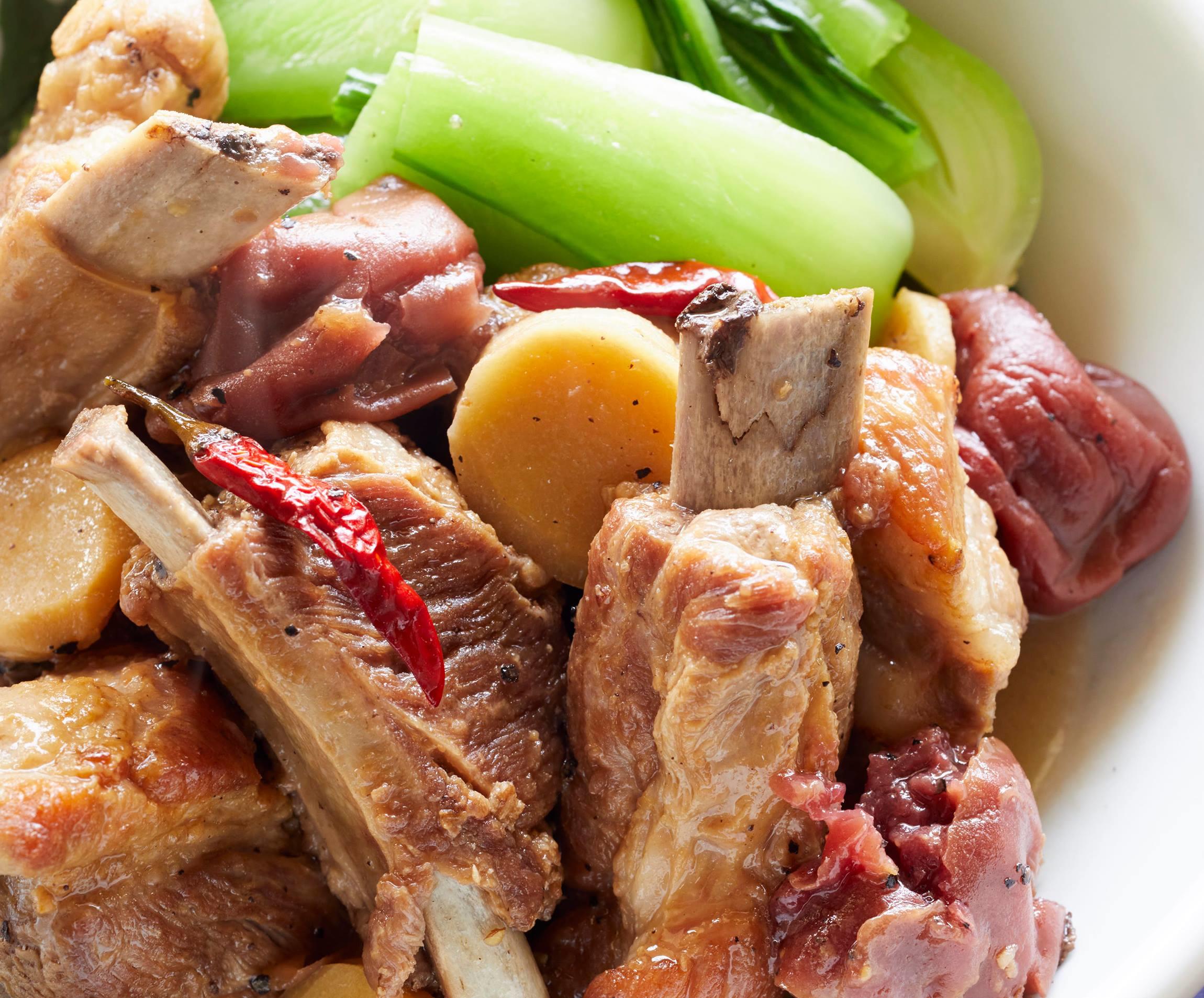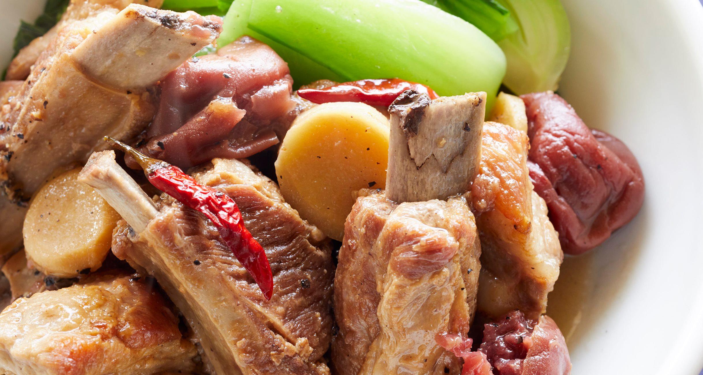 青梗菜は縦4等分に切り、塩少々(分量外)を入れた熱湯でゆでて冷水にとって冷まし、水気を絞り、長さ4~5cmに切っておく。スペアリブが煮えたら、器にスペアリブを盛って生姜、赤唐辛子、梅干しをのせ、残りの煮汁に青梗菜を入れてひと煮して添え、残りの煮汁をかける。