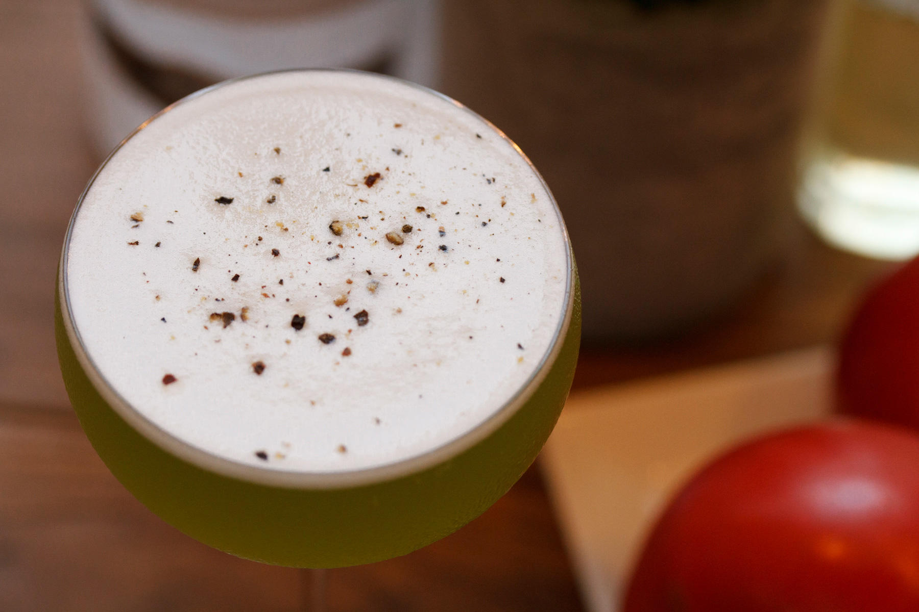 「最後は、トマトとバジルとホエー(乳清)を合わせたカクテルです。カプレーゼの要素を詰め込みました」と言い、スッとグラスを差し出す高宮さん。