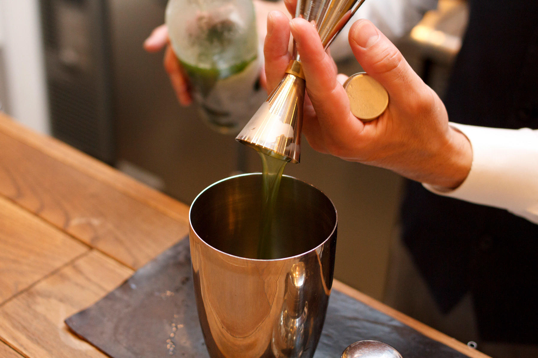 バジルとウォッカ700mlをミキサーに入れる。蓋を閉め、バジルの形がなくなるまで撹拌する。コーヒーフィルターで裏漉して、バジルウォッカをつくる。1人分30mlを使う。