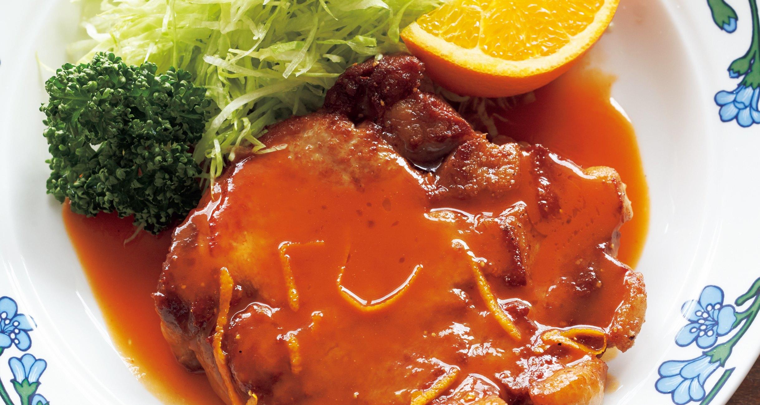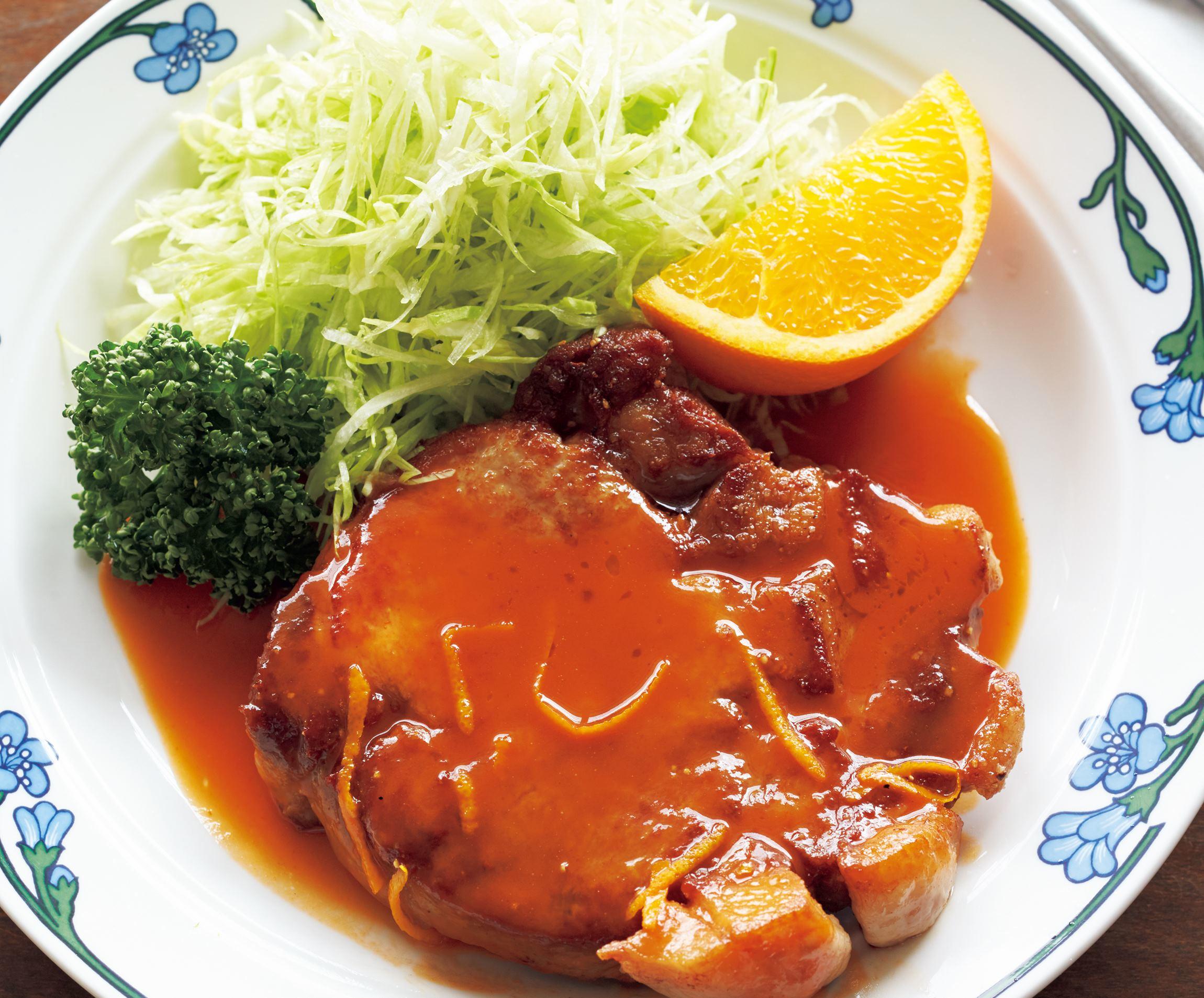ドン!と厚切りの豚肉を、オレンジをきかせたケチャップのソースでいただきます。豚肉の旨味と脂、ケチャップの風味がお互いをググ~ンと高め合います。