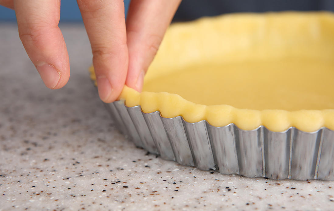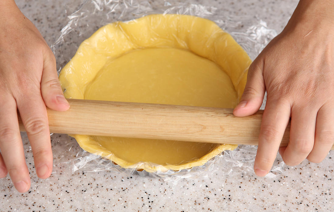 生地を挟んでいる上のラップをはずし、そっと型に生地を被せる。型に生地を密着させたら、上からめん棒で押さえつけ、はみ出た生地を取り除く。側面の生地をしっかりと型にくっつけたら、ラップをはずし、はみ出た生地が斜めになるように指でつまむ。