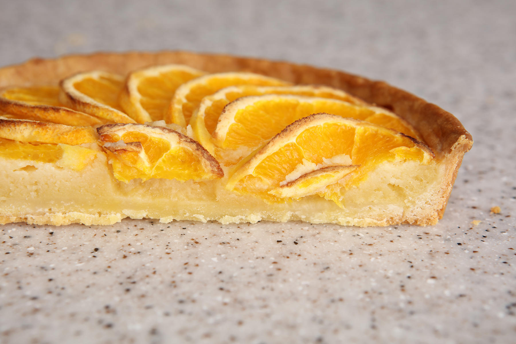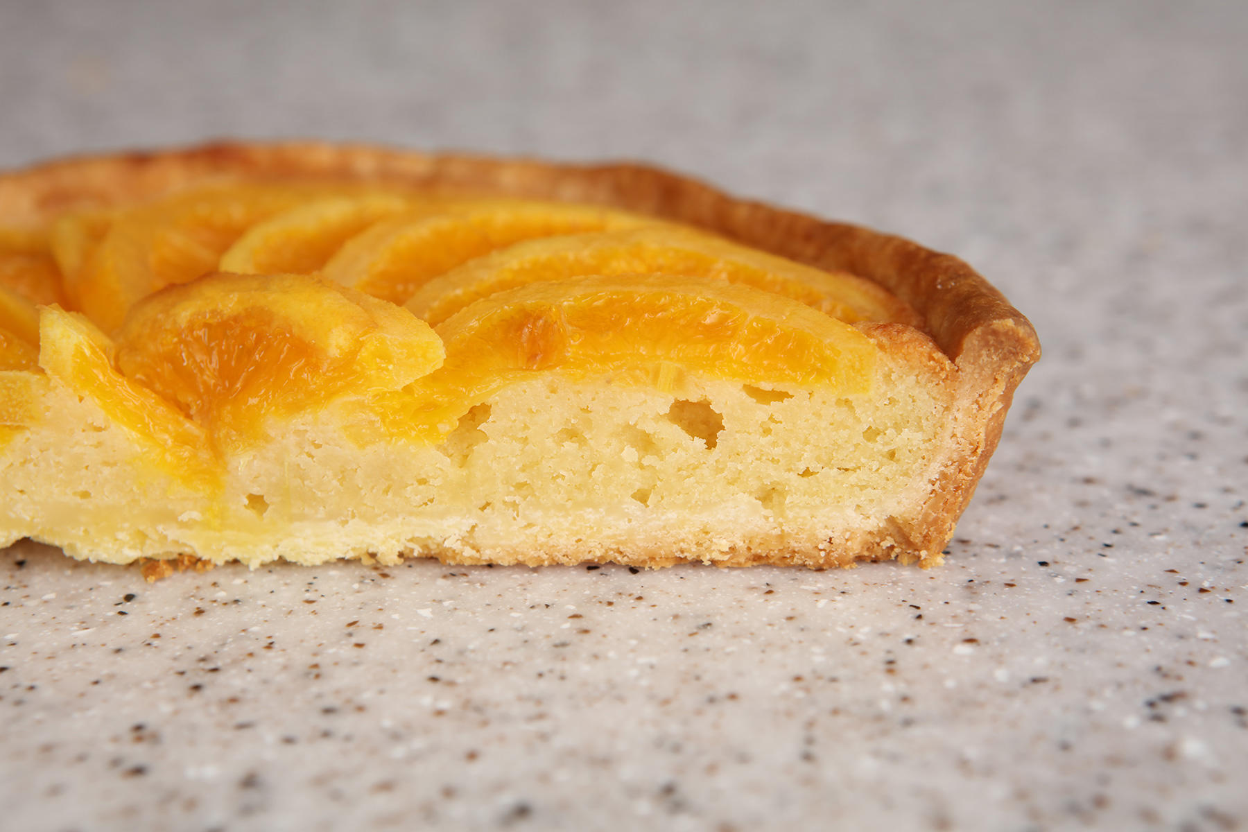 オーブンを180度に予熱しておく。2のオレンジを螺旋状になるようにして、アーモンドクリームの上に並べて、中心は半月型のオレンジをさらに4等分に切り分けて、敷き詰める。