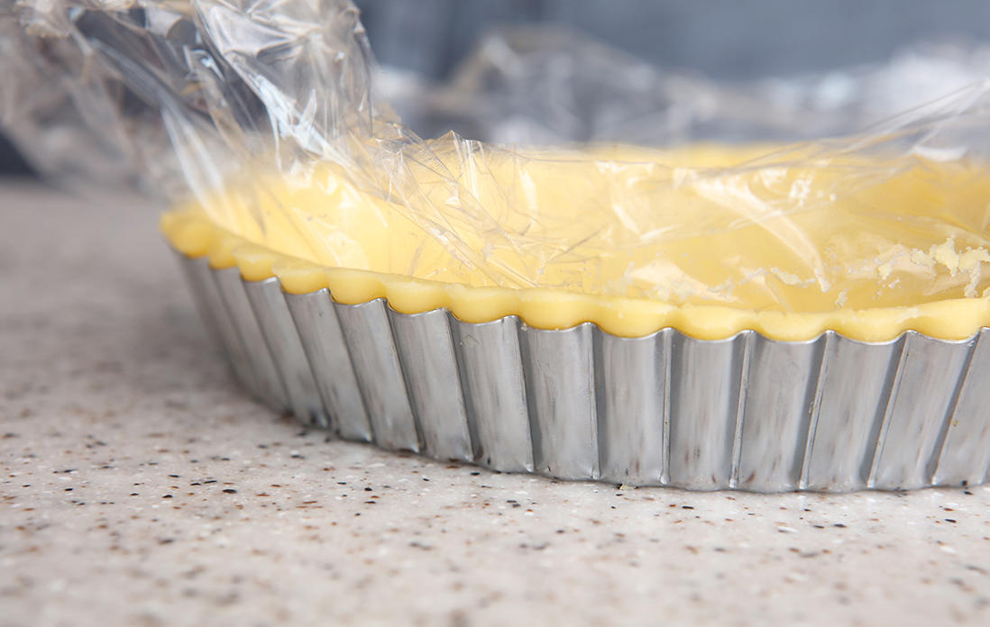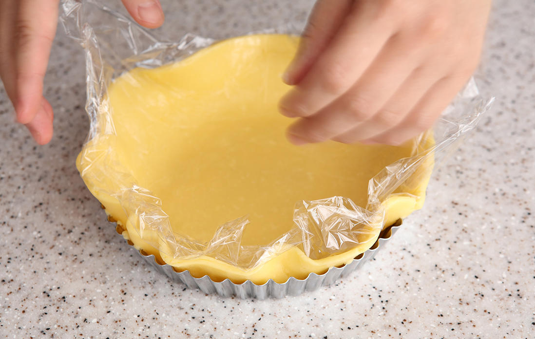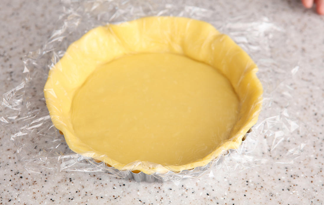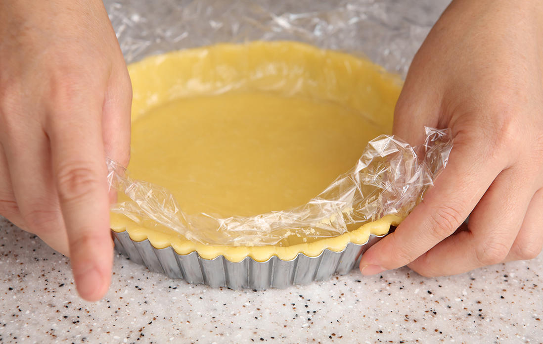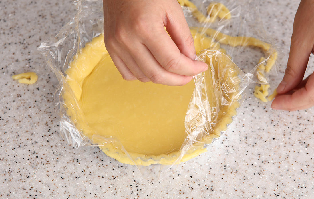 40cmほどの大きさに切ったラップを2枚用意する。冷蔵庫から取り出した生地をラップの間に挟んで、めん棒で5mmの厚さに伸ばす。タルト型よりひとまわり大きな円形にする。