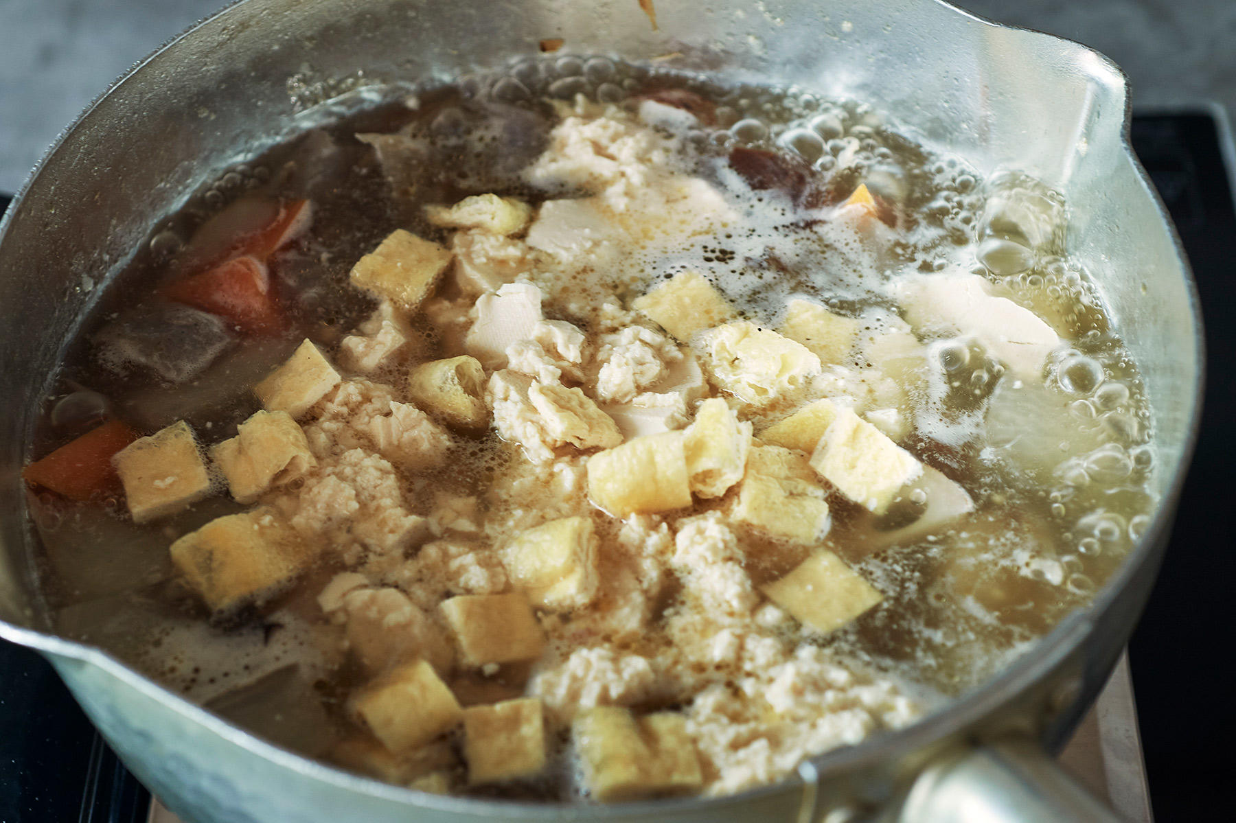 里芋が柔らかくなったら、油揚げと手で崩した豆腐を加える。醤油と干し椎茸のだしで味を整えて、ひと煮立ちしたら器によそってでき上がり。