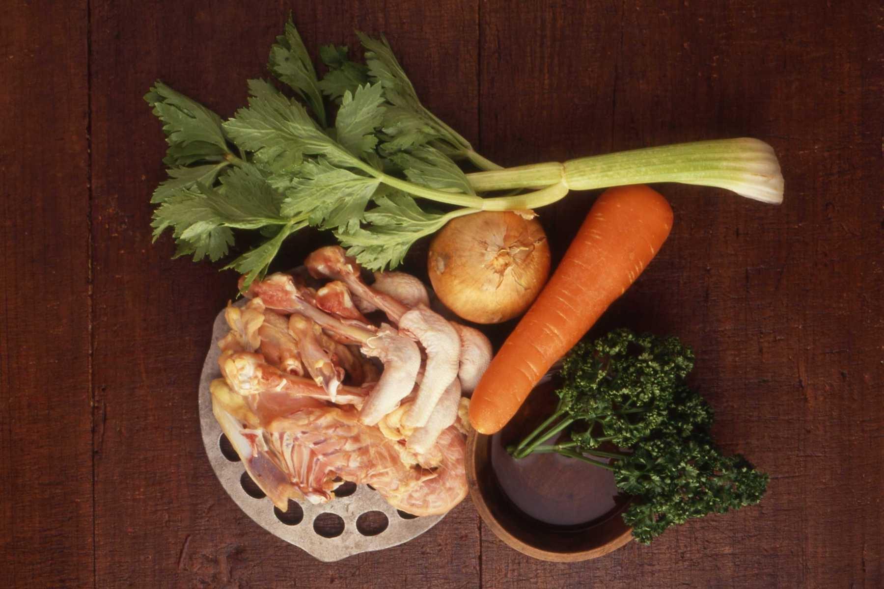 粗く刻んだセロリ、玉ねぎ、にんじんと香辛料を一度に入れる。アクを取りながら70分煮出す。2.5ℓの煮汁が2ℓに煮詰まれば、ブイヨンのでき上がり。