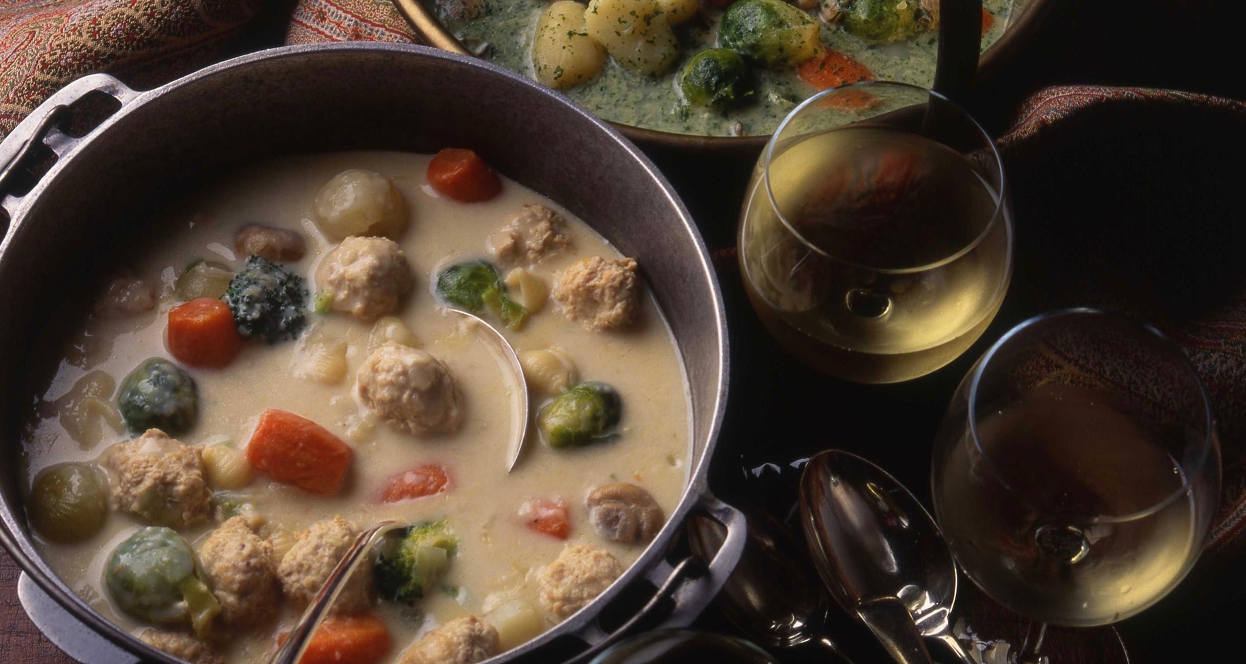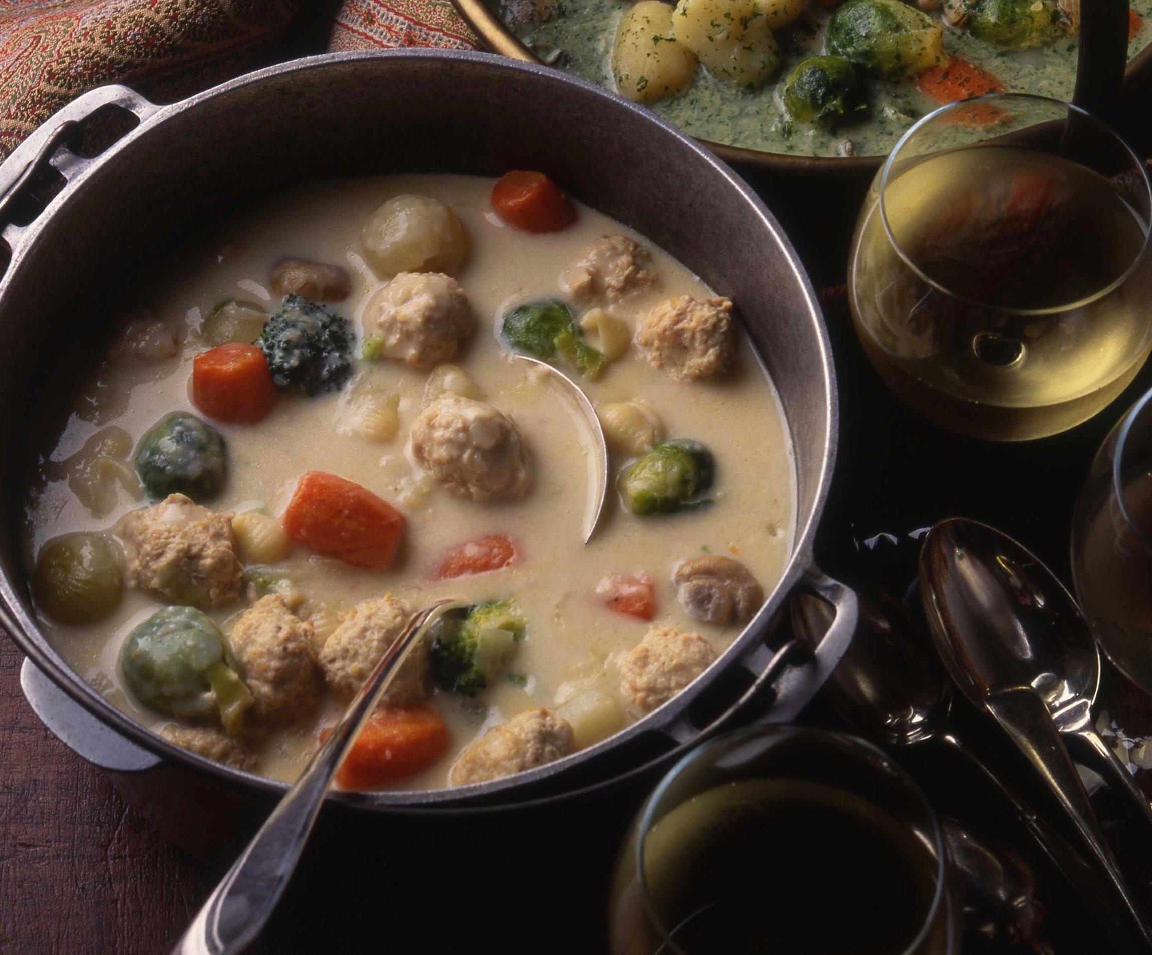 3を手でつかみ、親指と人差し指でつくった円から押し出しながら、煮汁で湿らせたスプーンですくい取って鍋へ加える。ミートボールの表面がしっかりと煮固まったら、芽キャベツとマカロニを静かに加える。