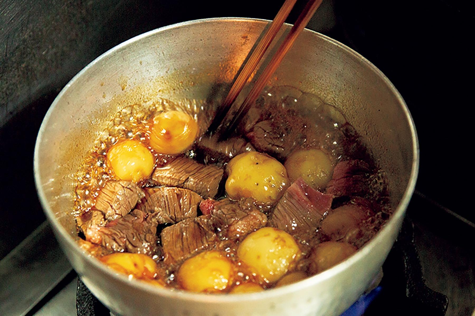 あらかじめ半量になるまで煮詰めた濃厚な煮汁で煮る。強火で泡になった煮汁をまとわせながら、短時間で馬鈴薯と牛肉に味を含ませるのだ。