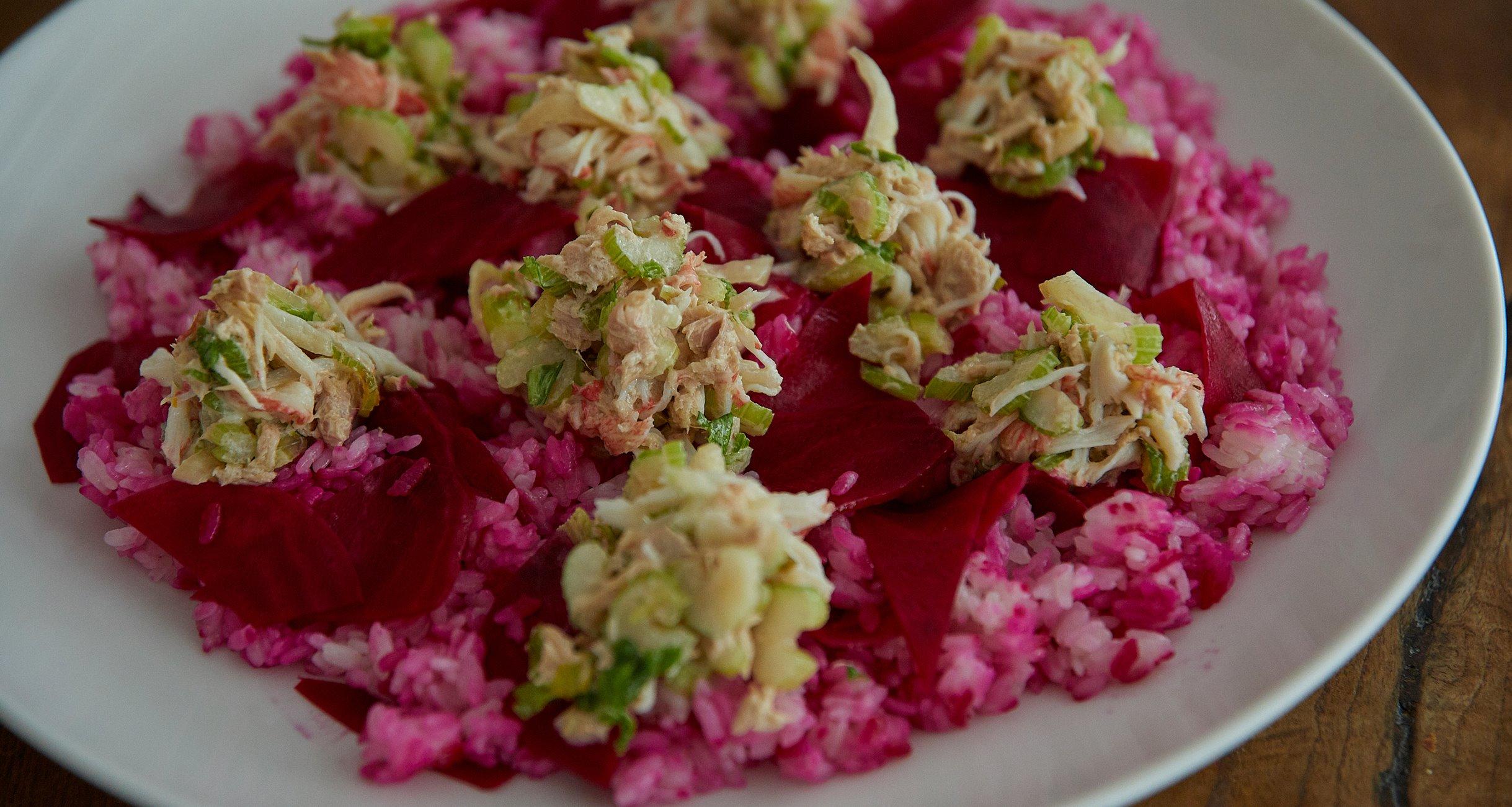 ピクルス液からビーツを取り出すときは、しっかりと汁気を切らず、軽くひと振り程度して酢飯に加えるくらいがちょうどよい色加減に染まります。お好みでピクルス液も回しかけて色味を調整してみてください。ツナやセロリをマヨネーズで和えたものを上に乗せれば、サラダ軍艦のようなちらし寿司の出来上がりです。