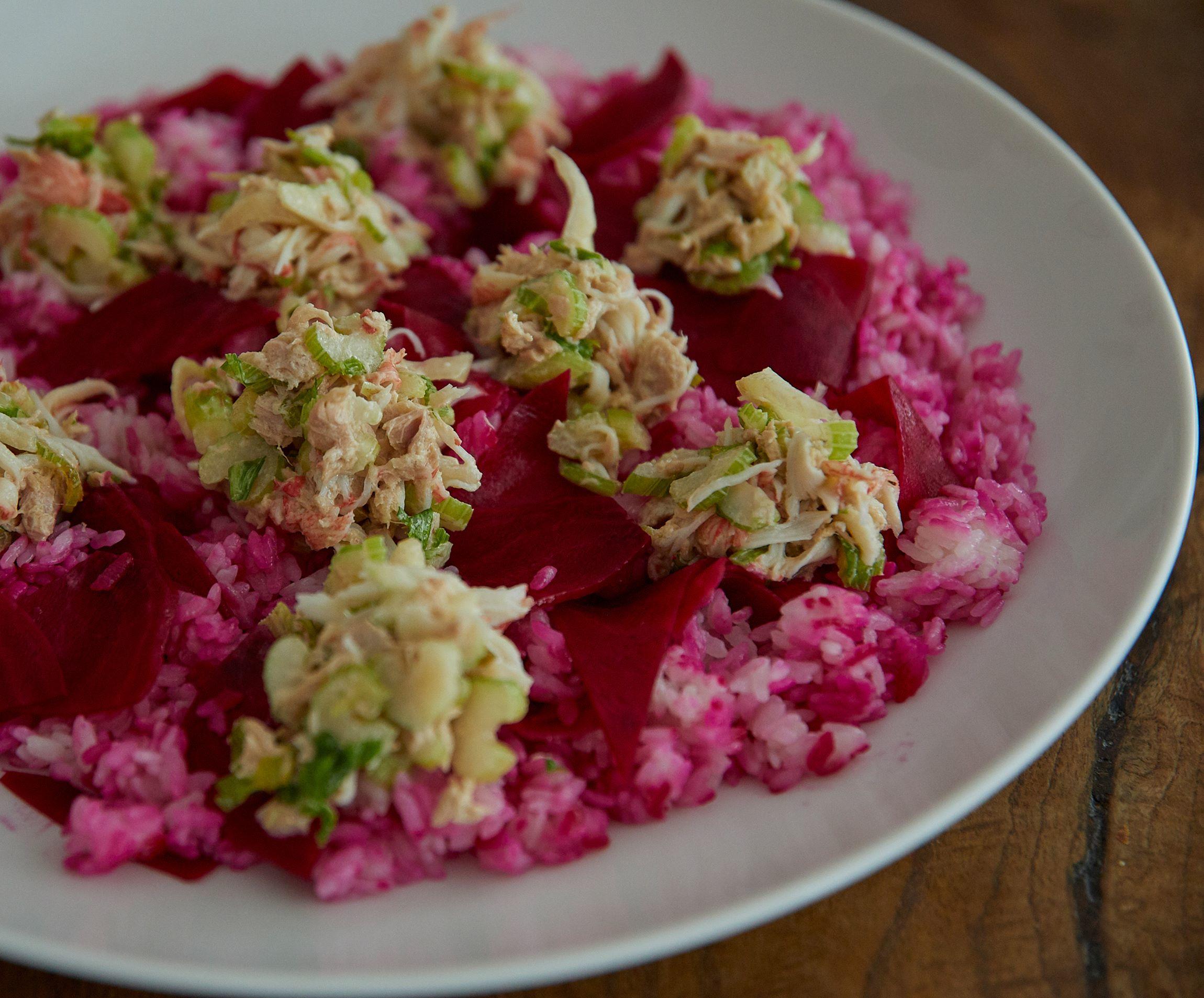 汁気を軽く切ったビーツのピクルスを米に加え、混ぜ合わせてから大皿に広げる。