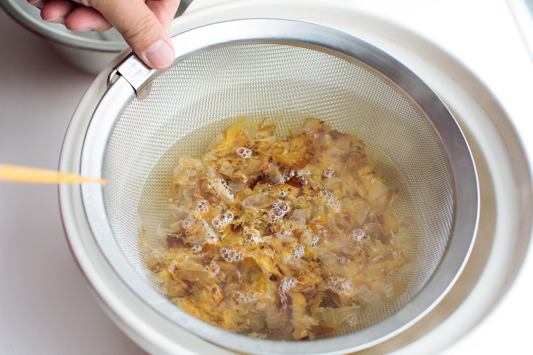 昆布を取り出したら一度沸騰させ、ザルに入れた鰹節をザルごと鍋に10秒ほど入れ、取り出す。塩、醤油で味付けをして完成。具材を入れると味が濃くなるので、少し薄いと感じるくらいの塩味でよい。おでんが煮詰まったときに加えられるように、多めにつくるのがよい。