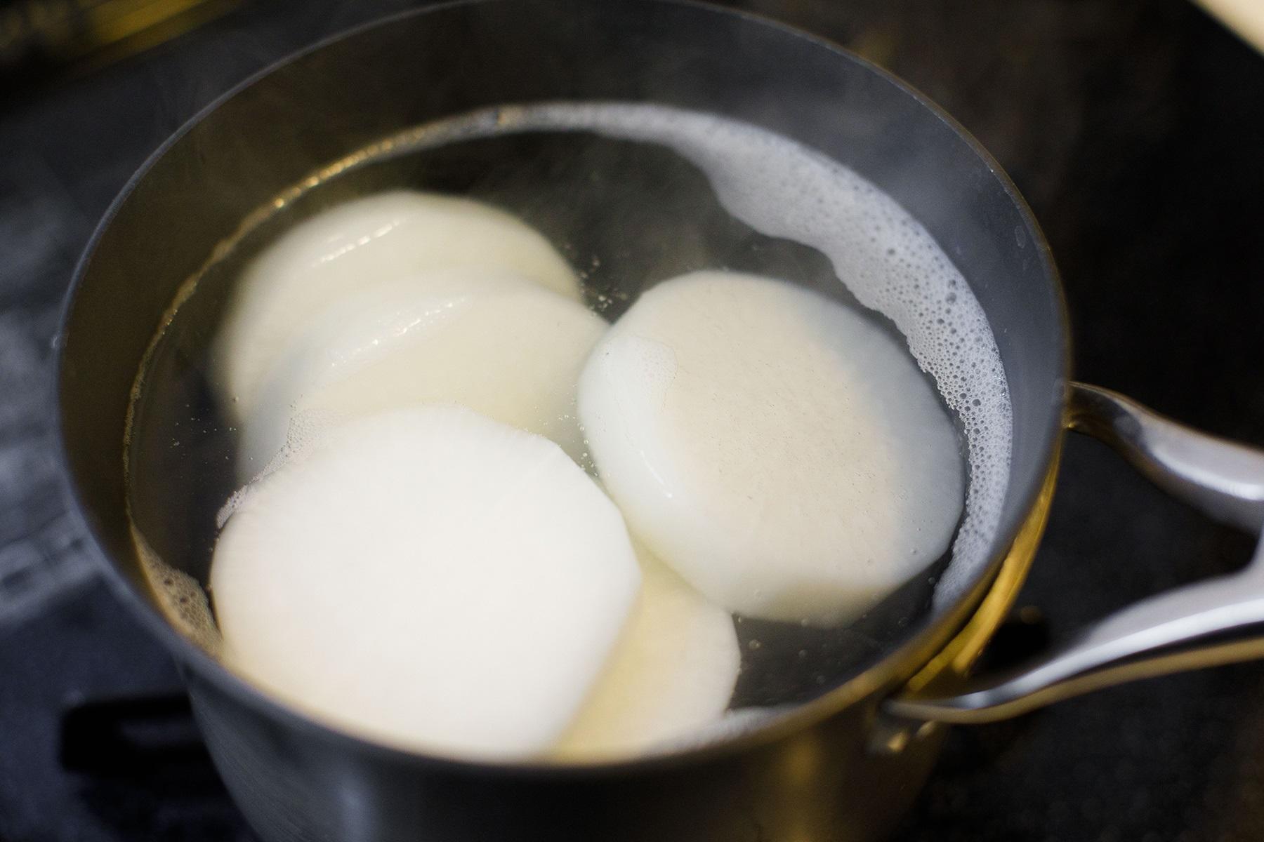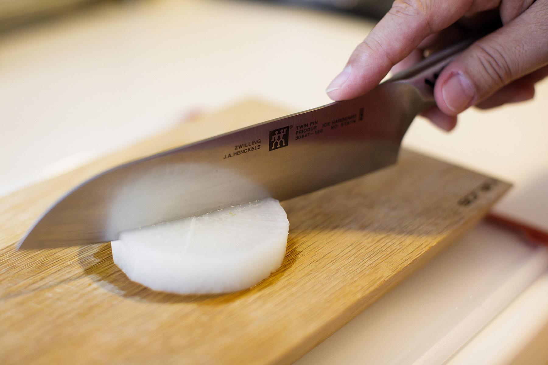 大根を厚さ3cm程度に切って皮を剥く。鍋に水と塩を少々入れ、大根を水のうちに入れて火にかける。楊枝がすっと通るようになるまで茹でる。茹で上がったら、大根の表面に2mmほどの切れ目を十字に入れ、だしを染み込みやすくする。