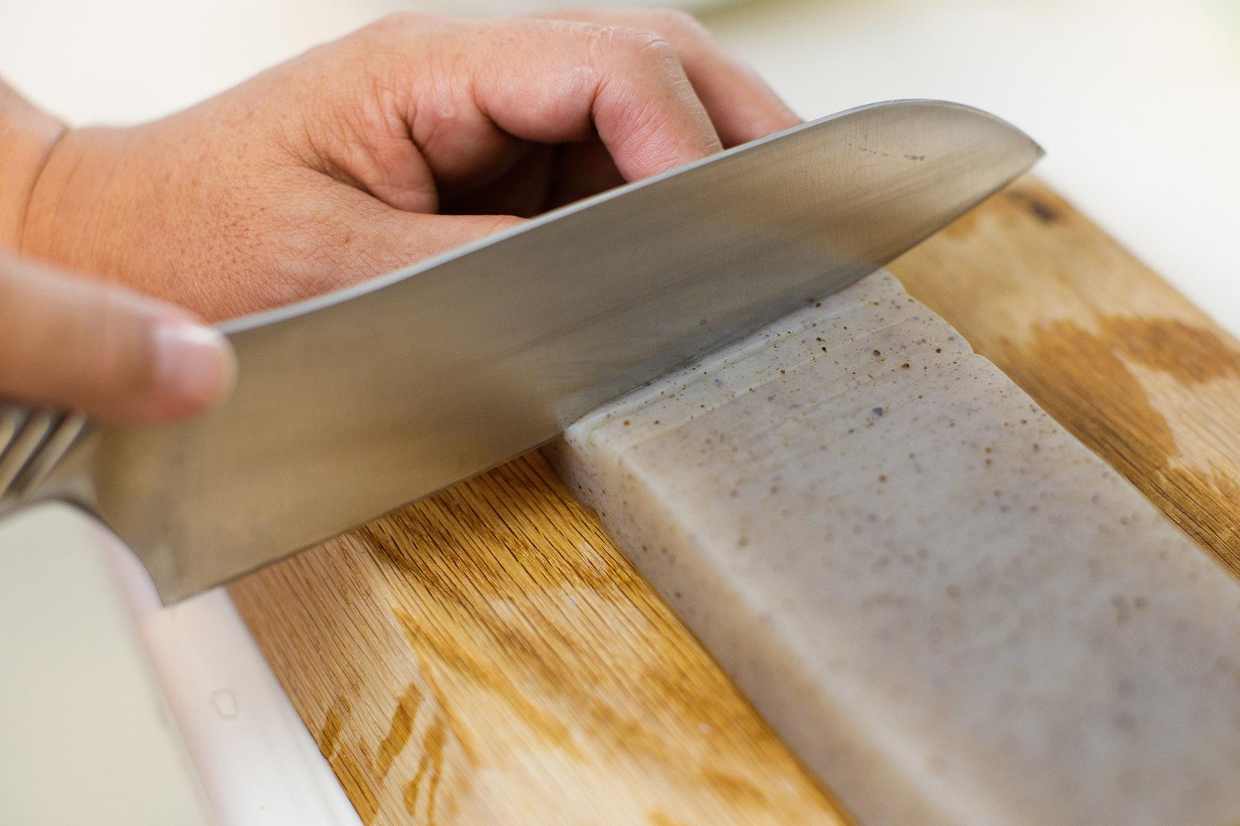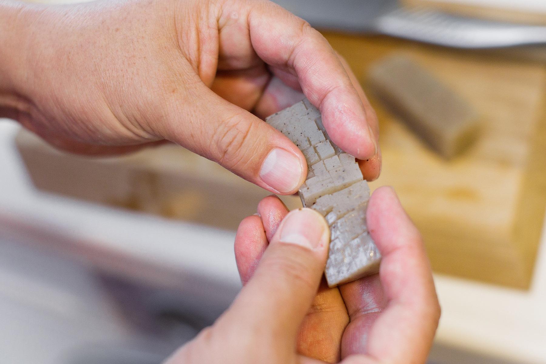 こんにゃくは、沸騰したお湯で2分ほど茹でる。下茹でをすることで、こんにゃく独特の臭みが抜ける。茹でたこんにゃくをザルに上げ水を切ったら、こんにゃくの表面に2mm間隔で、縦横に切れ目を入れ、一口大にカットする。