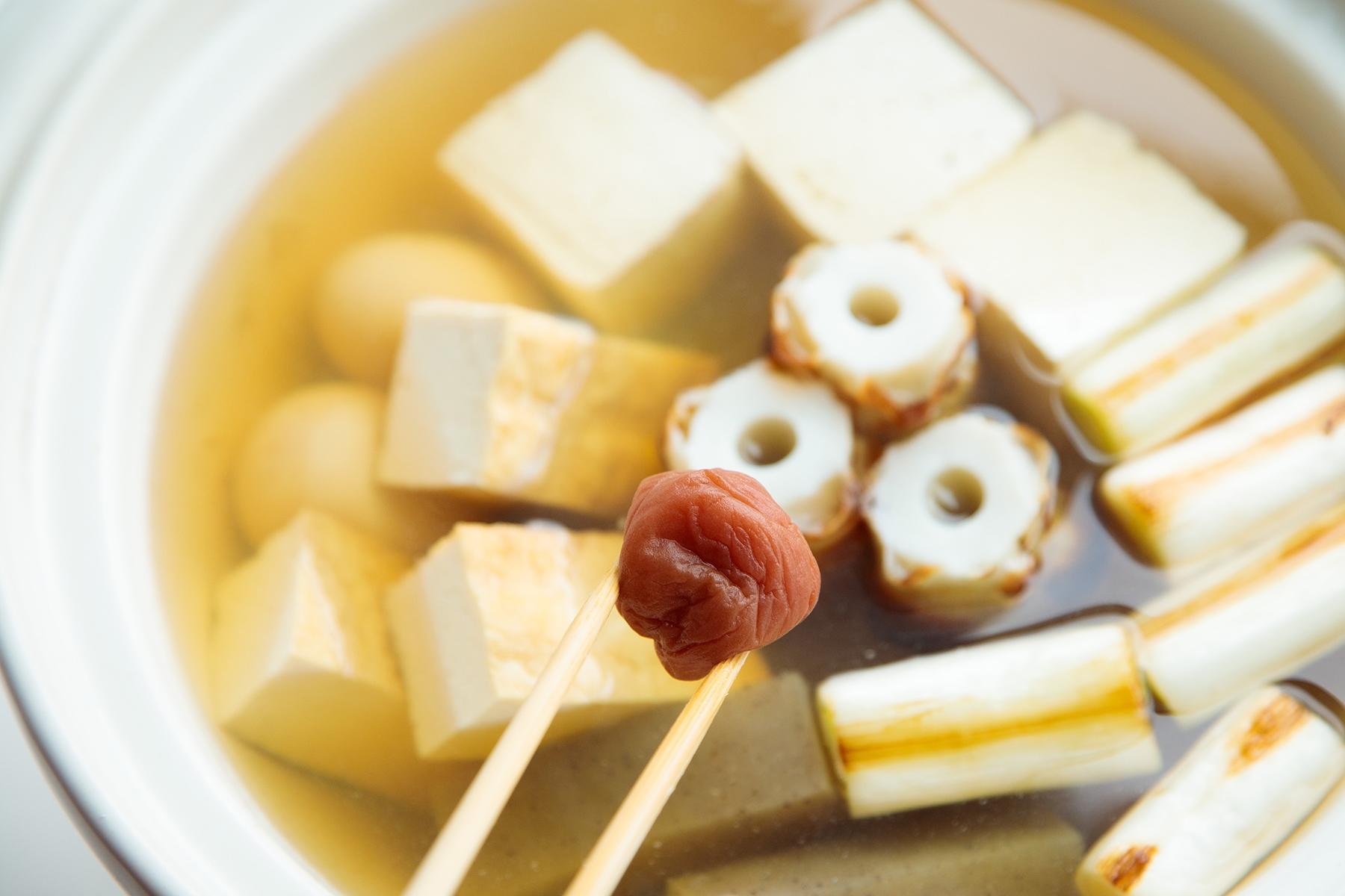 香ばしい風味を出す焼きねぎと、塩味と酸味のある梅干しを加えることで、つゆの味わいを引き締める。