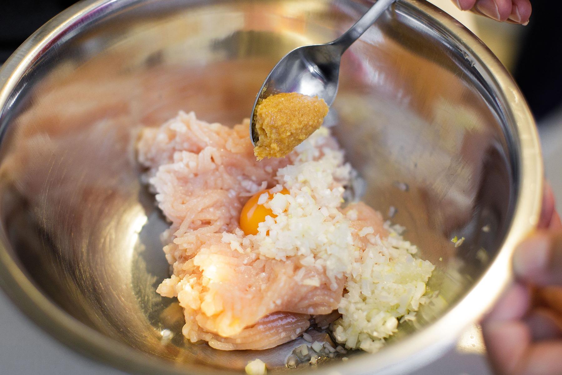 食感がなめらかになるように、細かく刻んだ長ねぎと、すべての材料を粘りが出るまでよく混ぜる。煮立った鍋にだんごを落とす。