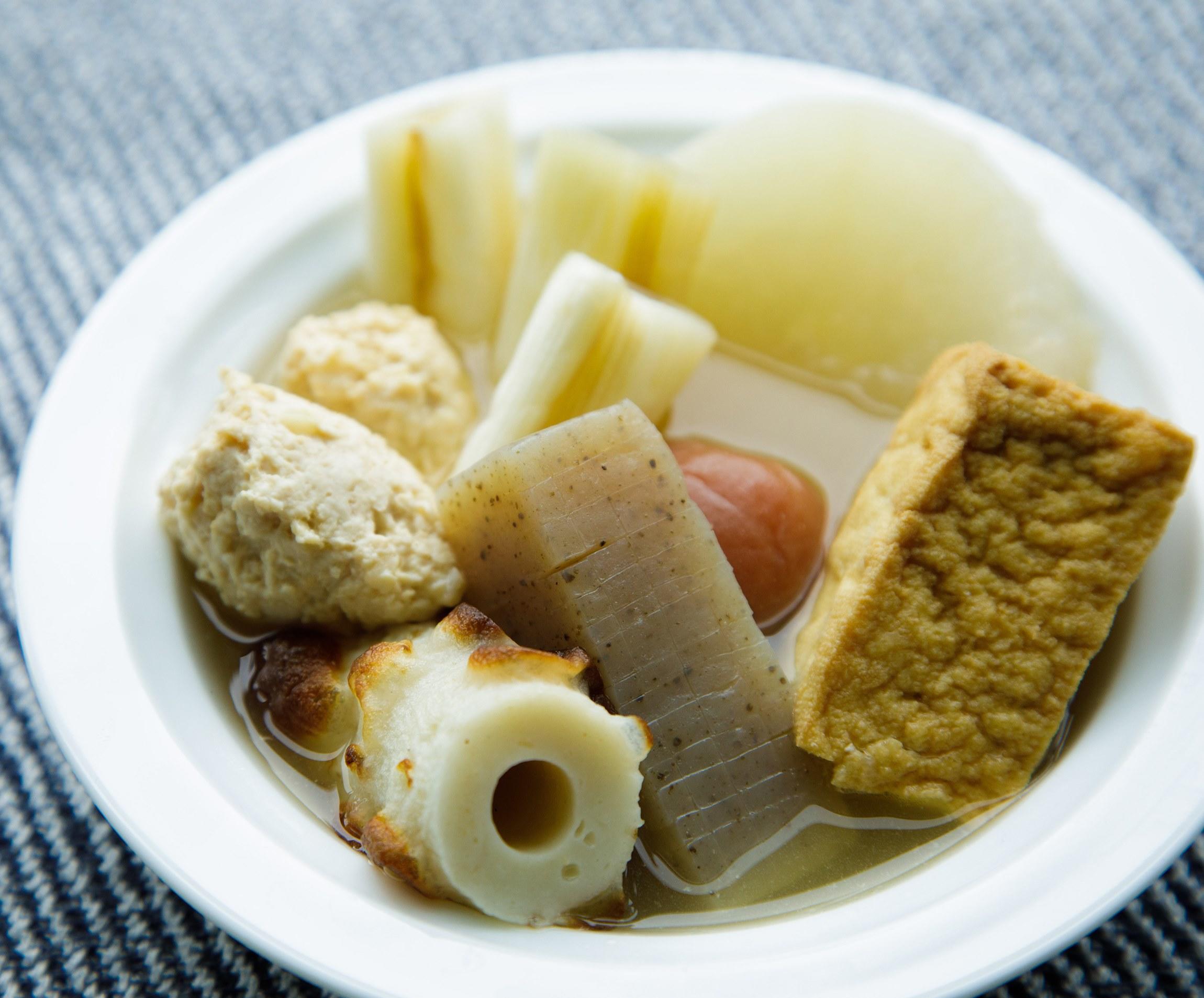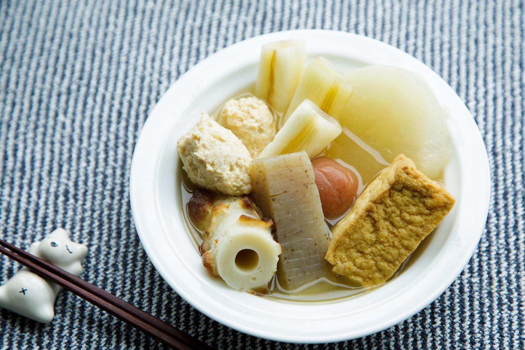 おでんの具と一緒に、旨味が染み出たつゆも皿に盛る。味が薄い場合は、塩、醤油、ポン酢などでつゆに味をつけよう。
