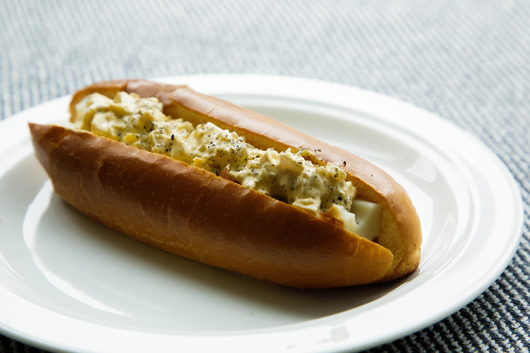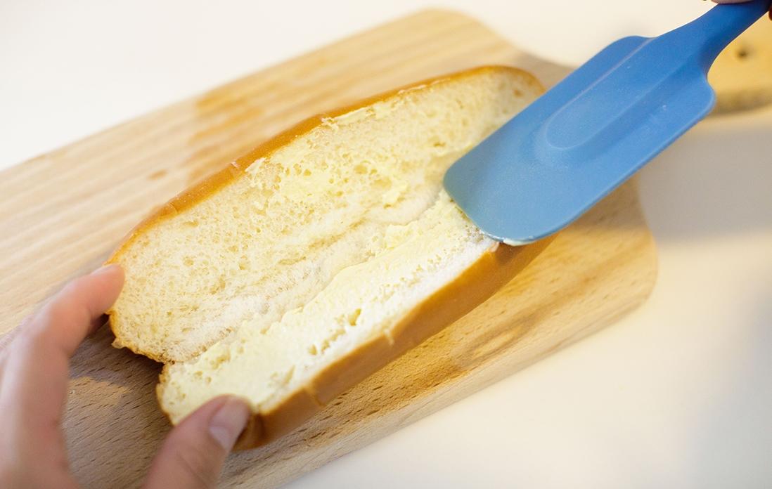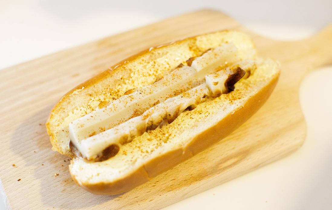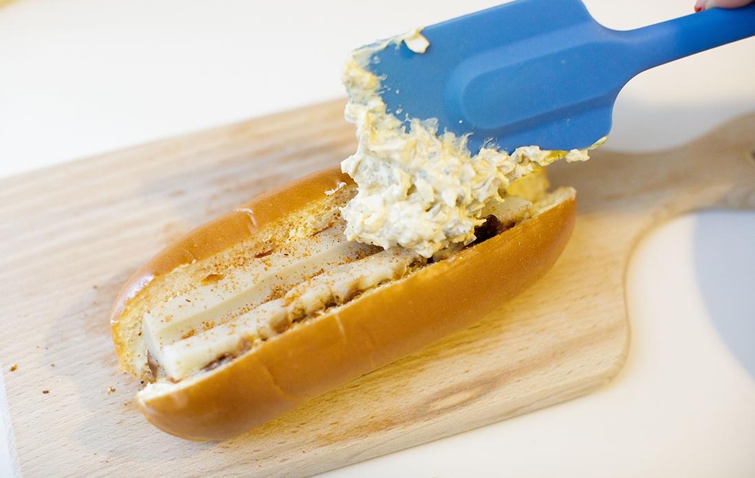 ホットドックパンは、軽くトースターで温める。温まったパンの切れ目に、からしマヨネーズをまんべんなく塗る。焼きちくわを半分に切って、ホットドックパンに詰め、カレー粉を振る。