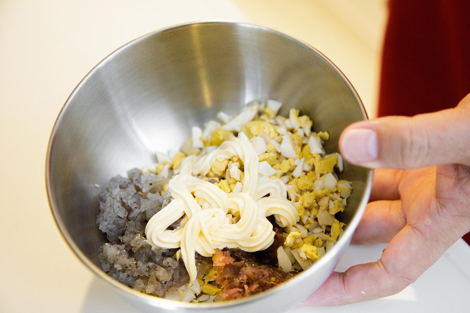 残ったたまご、こんにゃくと柴漬けを細かく刻む。ボウルに全ての具材とマヨネーズを入れて混ぜる。このままつまみとして食べても美味しいが、もうひと工夫。
