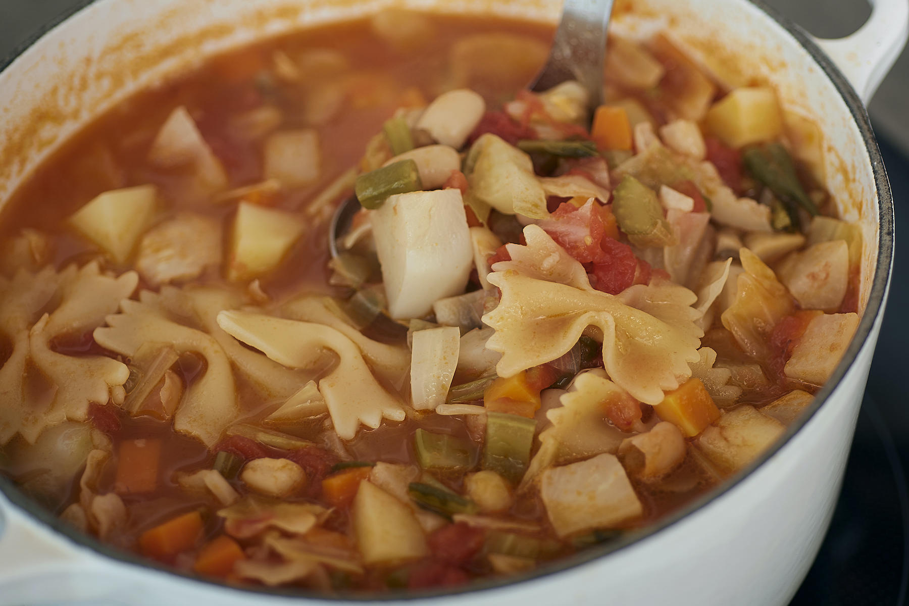 ミネストローネといえばトマト、にんにく、オリーブオイルというイメージですが、イタリアでは必ずしもトマトが入るわけではないのです。むしろ、必須なのは豆やパスタ、米などの炭水化物です。これは一皿のスープでお腹を膨らませようとする、庶民の知恵でしょう。