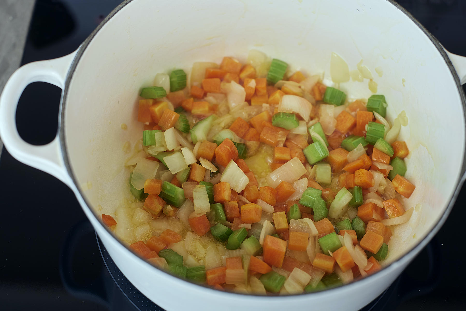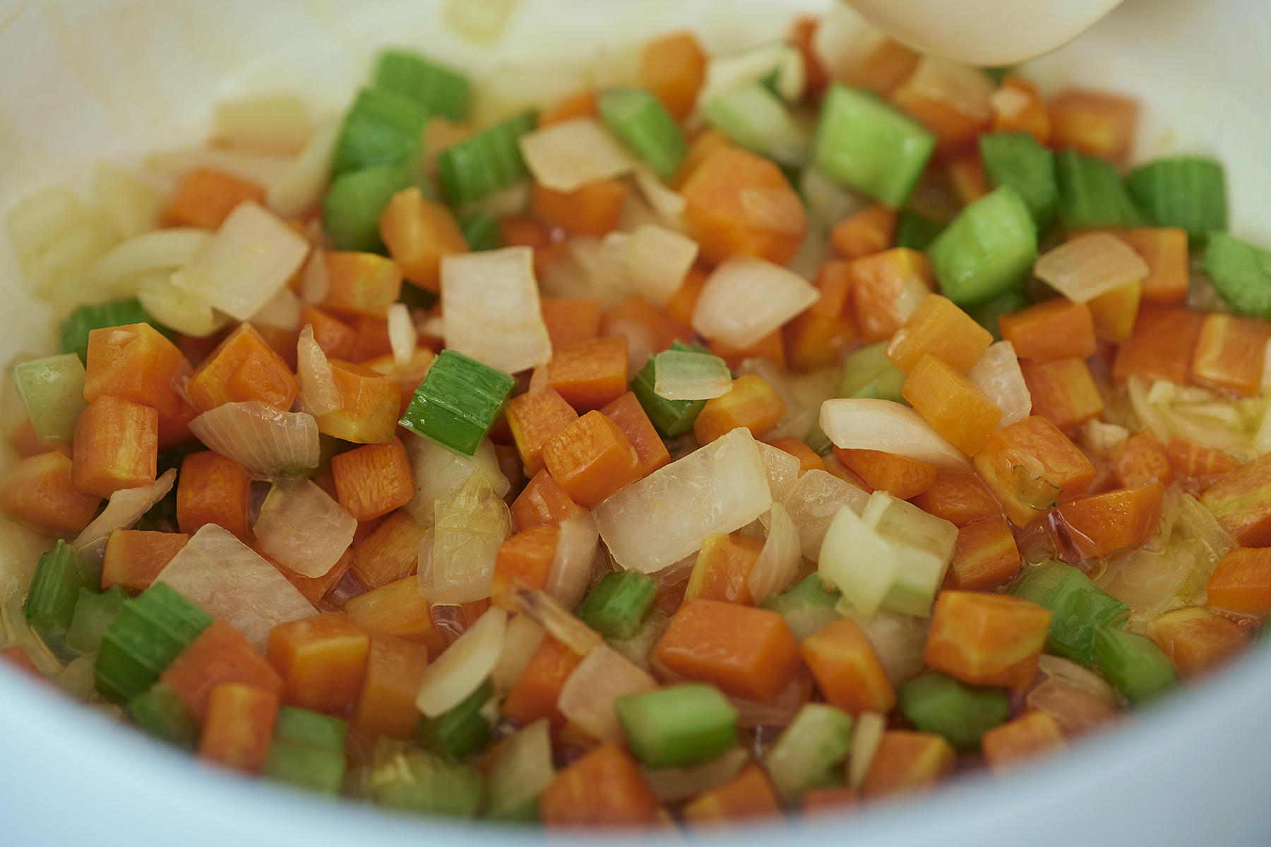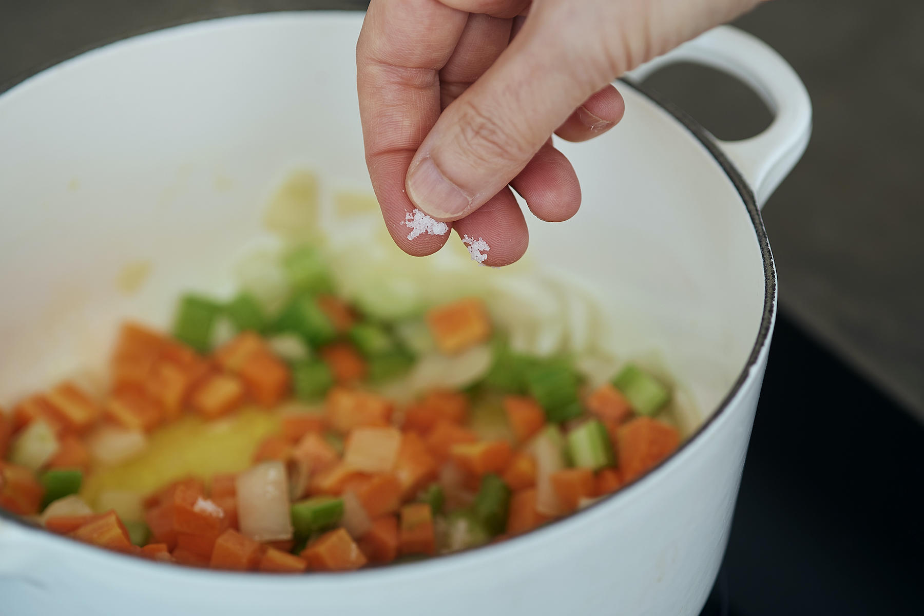 鍋に野菜と塩をひとつまみ入れると、野菜の水分が出やすくなり、旨味が凝縮します。水分を補いながら、あまり色づけずに炒めていきます。