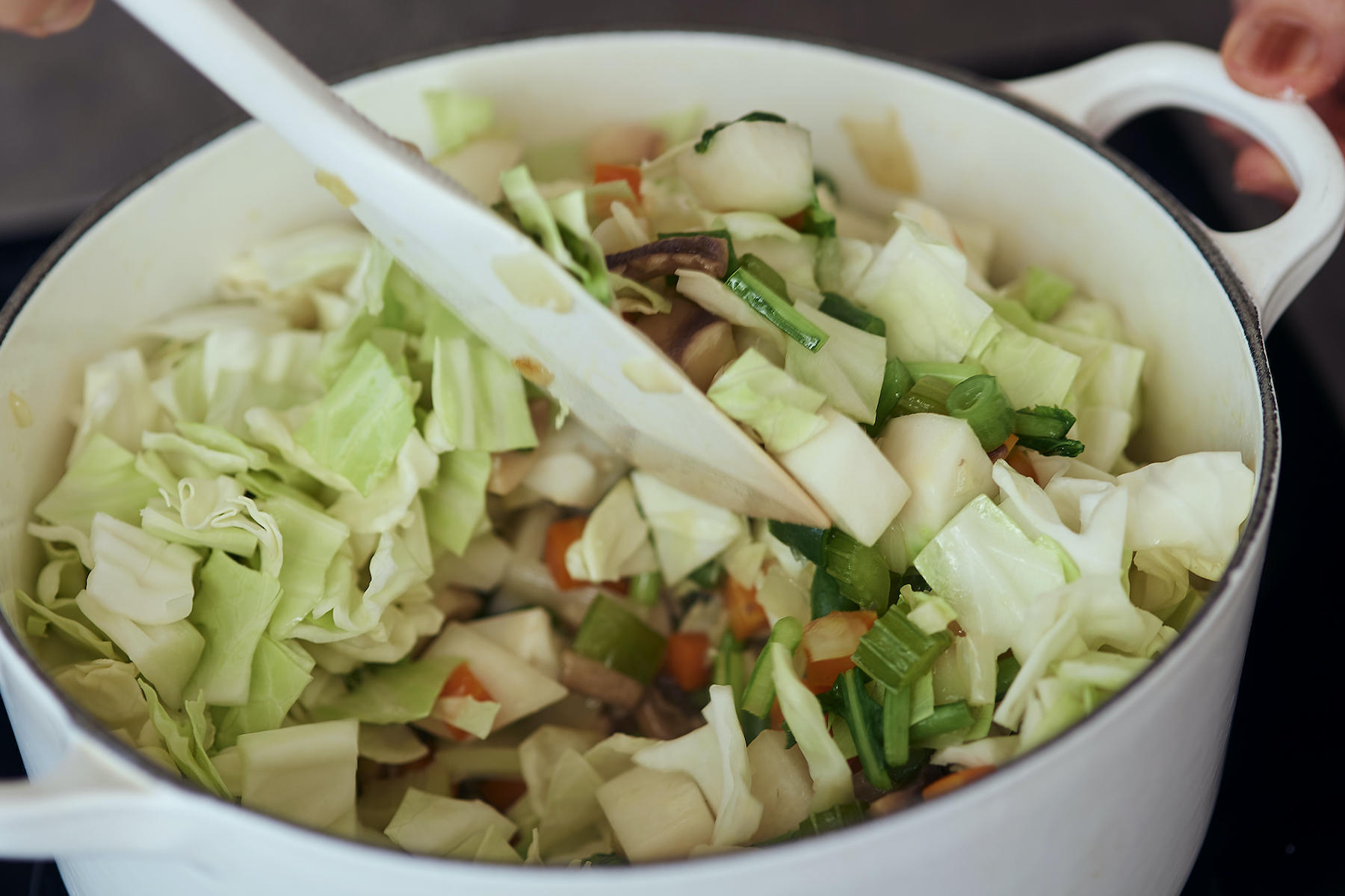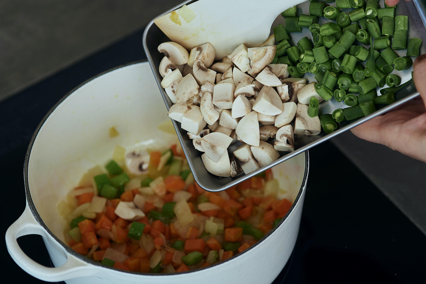 オリーブオイルをひいた鍋を中火で熱し、玉ねぎを入れて塩ひとつまみを加えて炒める。水分が出てきたら、にんじん、セロリを入れ、塩をひとつまみ足してさらに炒める。野菜の水分が足りなくなって焦げ付きそうなら、大さじ1ほどの水を加えて蒸すように炒める。にんにく、マッシュルーム、いんげん、かぶ、かぶの葉、キャベツの葉の順に鍋に足しながら炒める。都度、ひとつまみずつ塩を加える。