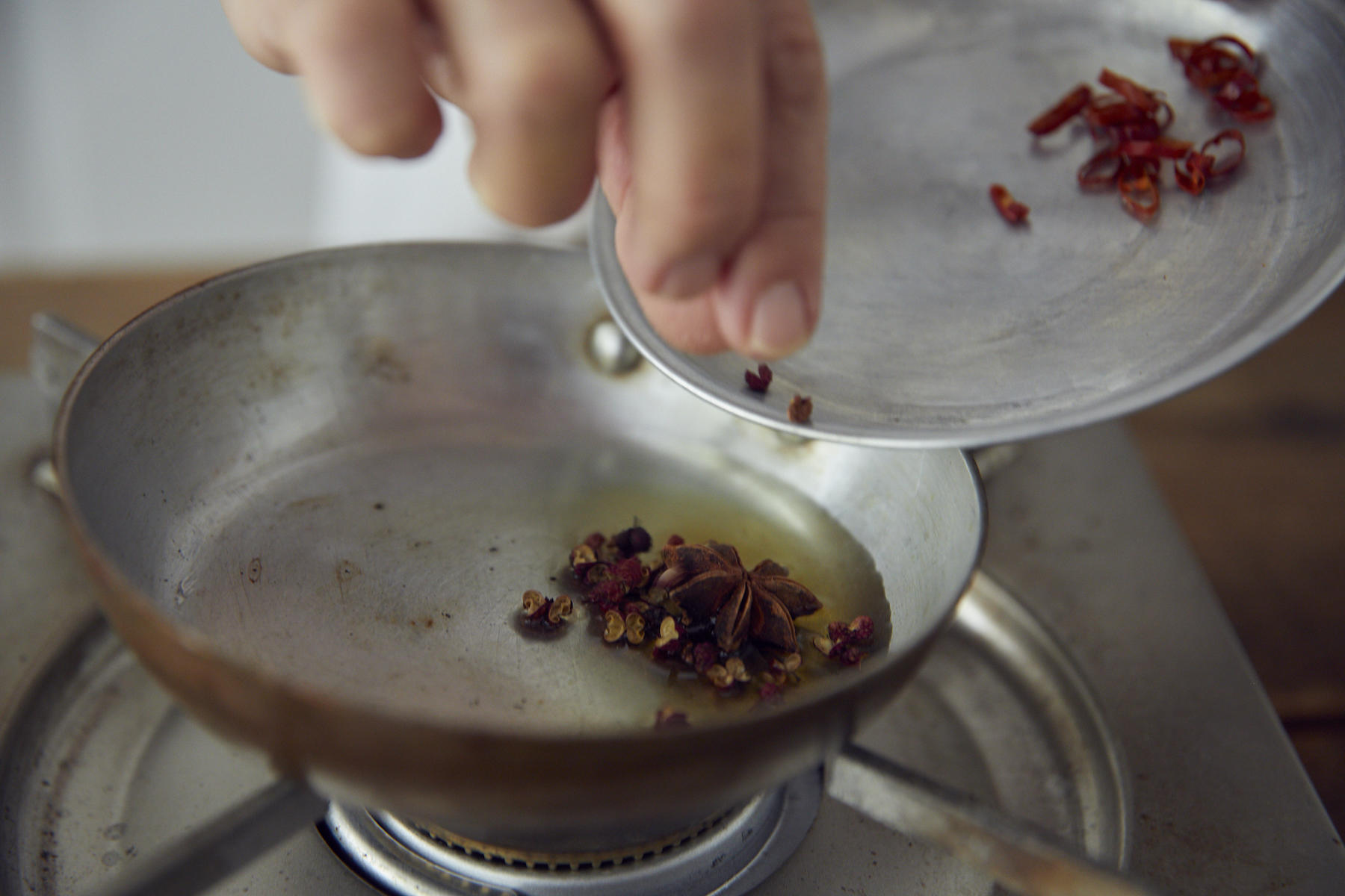 花椒の華やかな香りと八角の中華らしい香り、赤唐辛子の旨味や辛味を油に十分にうつし、熱々の状態でジャッ!と食材にかけるだけ。
