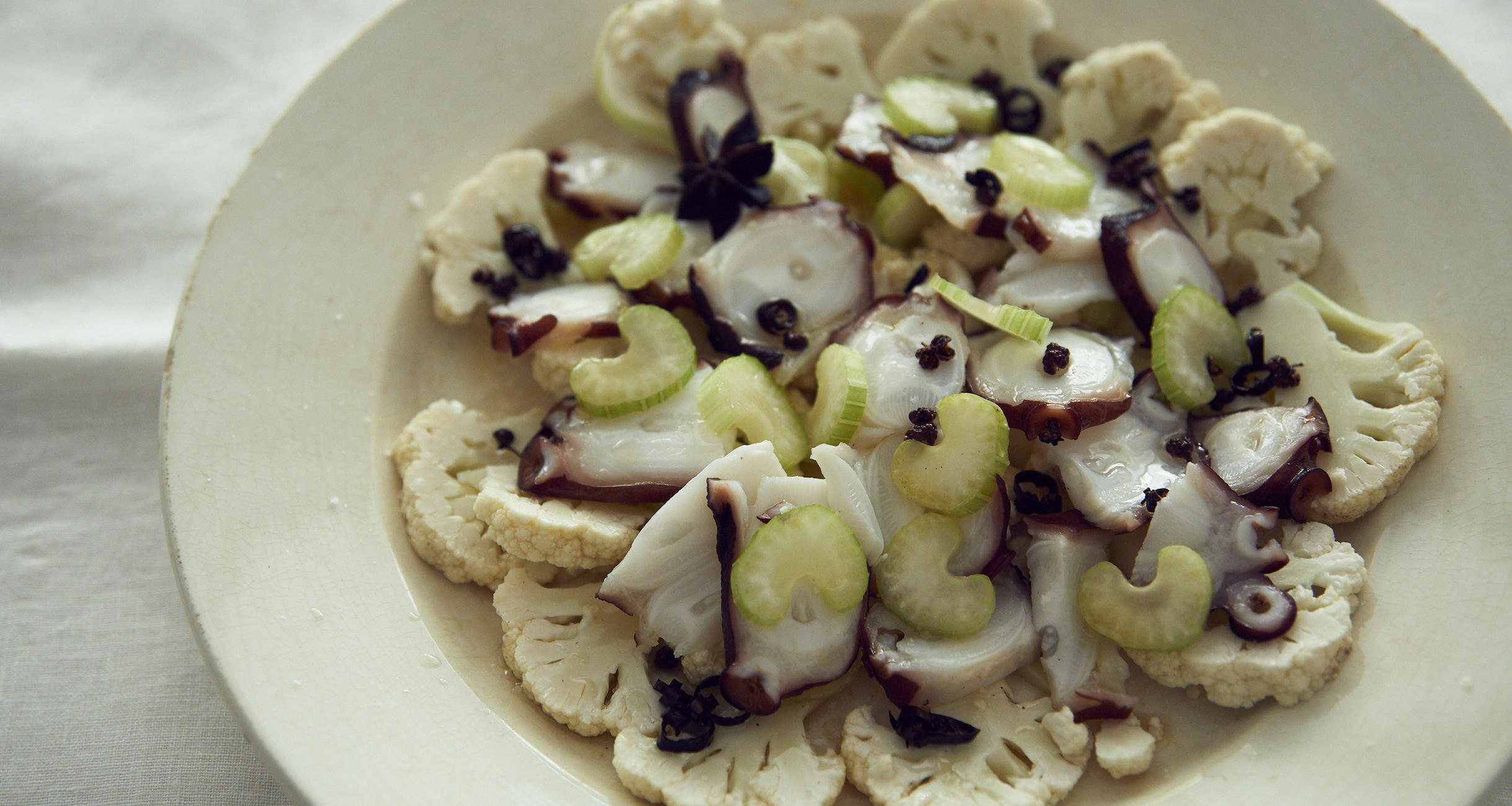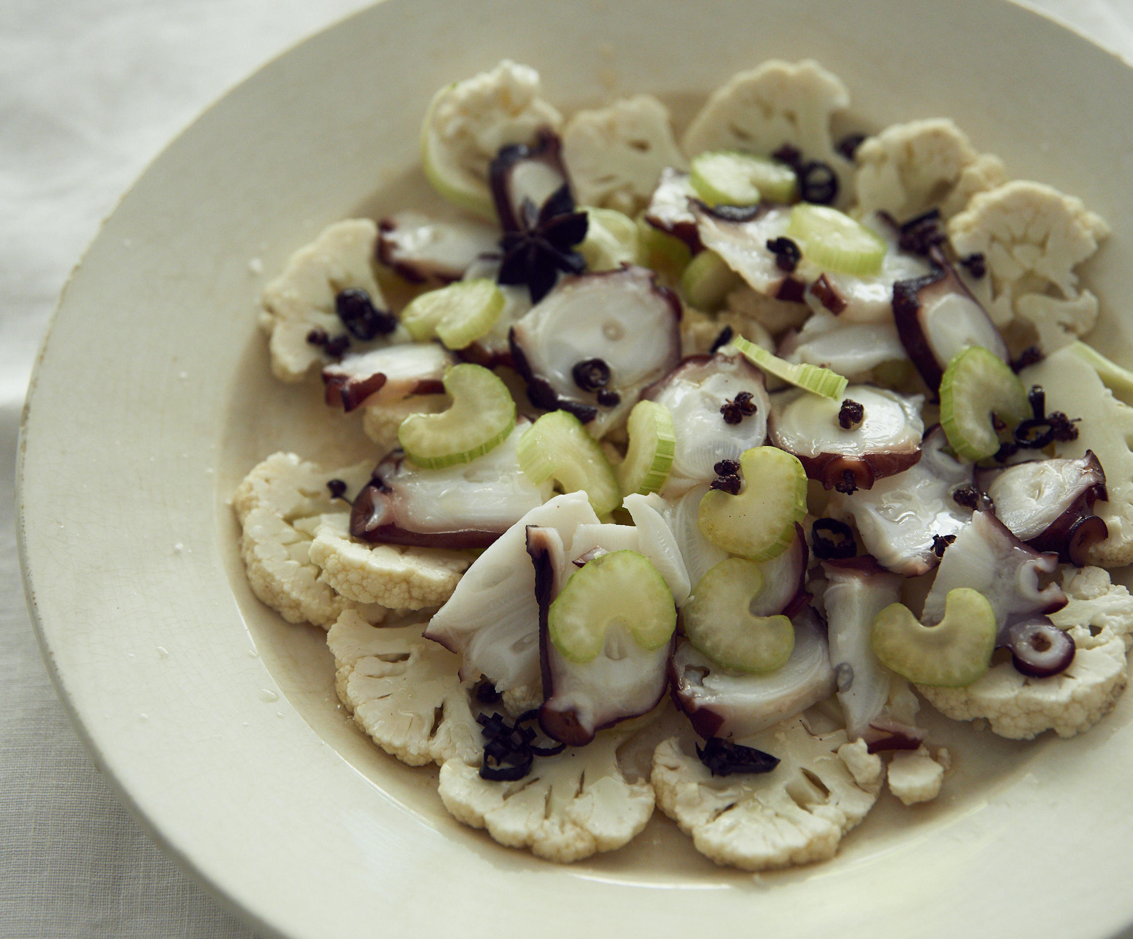 カリフラワーのコリッとした食感とタコのムニュッととした弾力、セロリの清々しい香りを楽しむシンプルな中華風の前菜です。