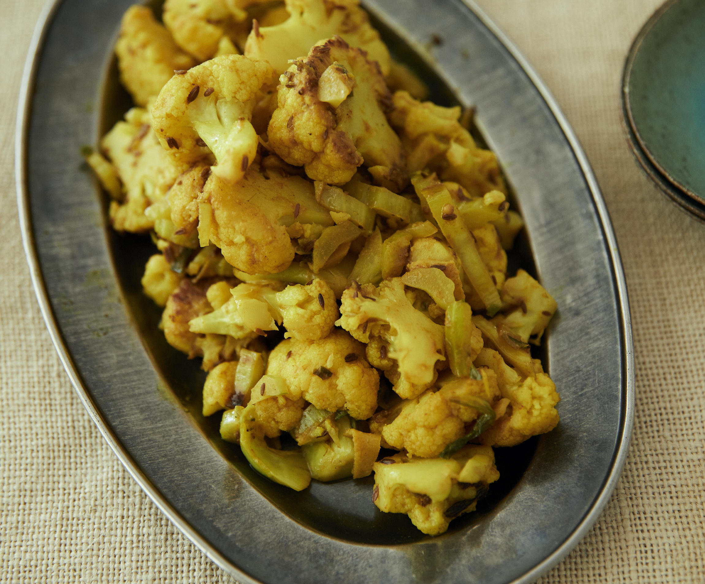 クミンやコリアンダー。ターメリックにカイエンヌペッパーといったインドカレーにおける主要スパイスをまとった黄金色のカリフラワーは、少し歯ごたえがありつつもほろほろっと崩れ、レモンの爽やかさが食欲をそそるひと皿になります。