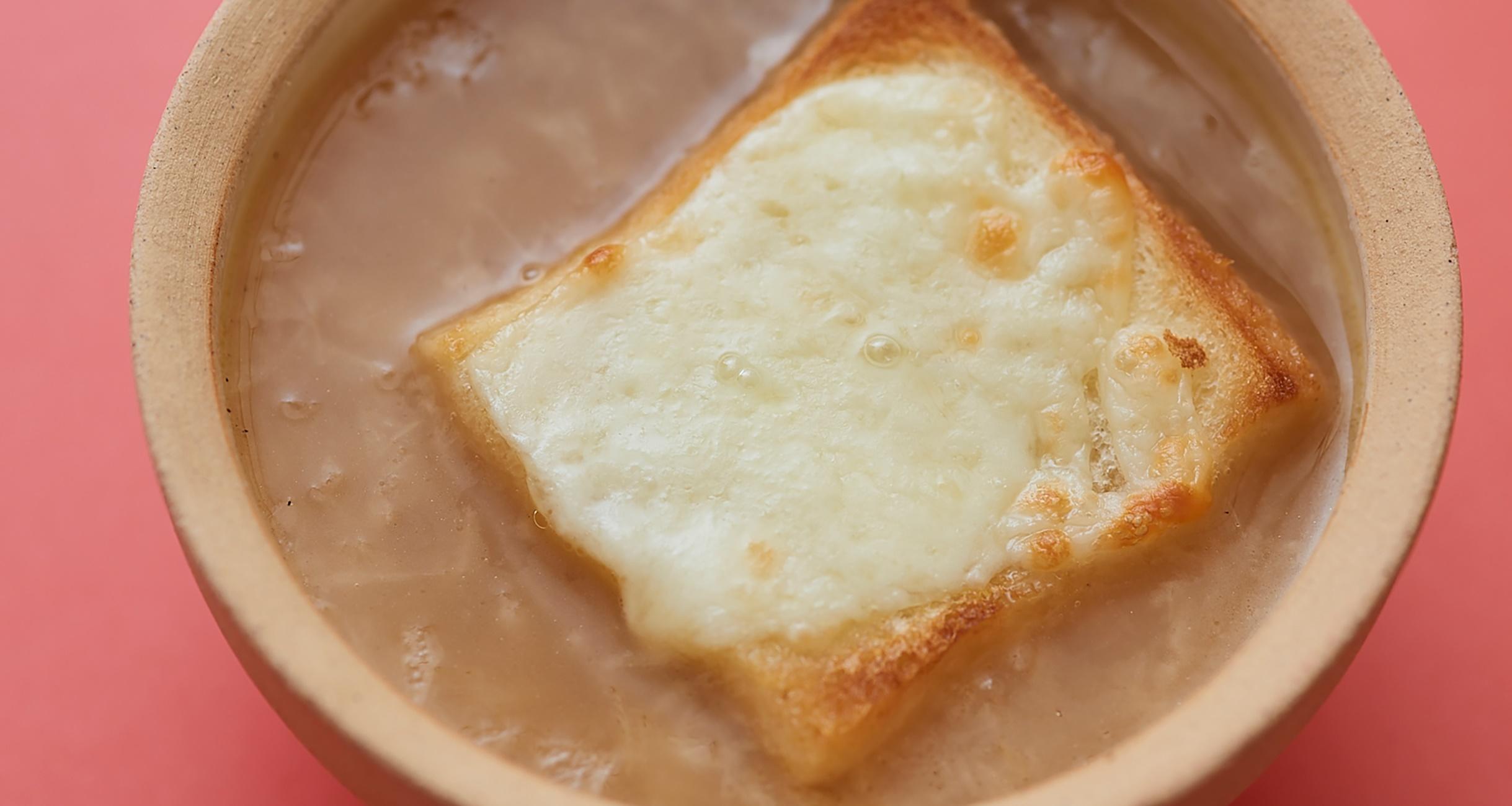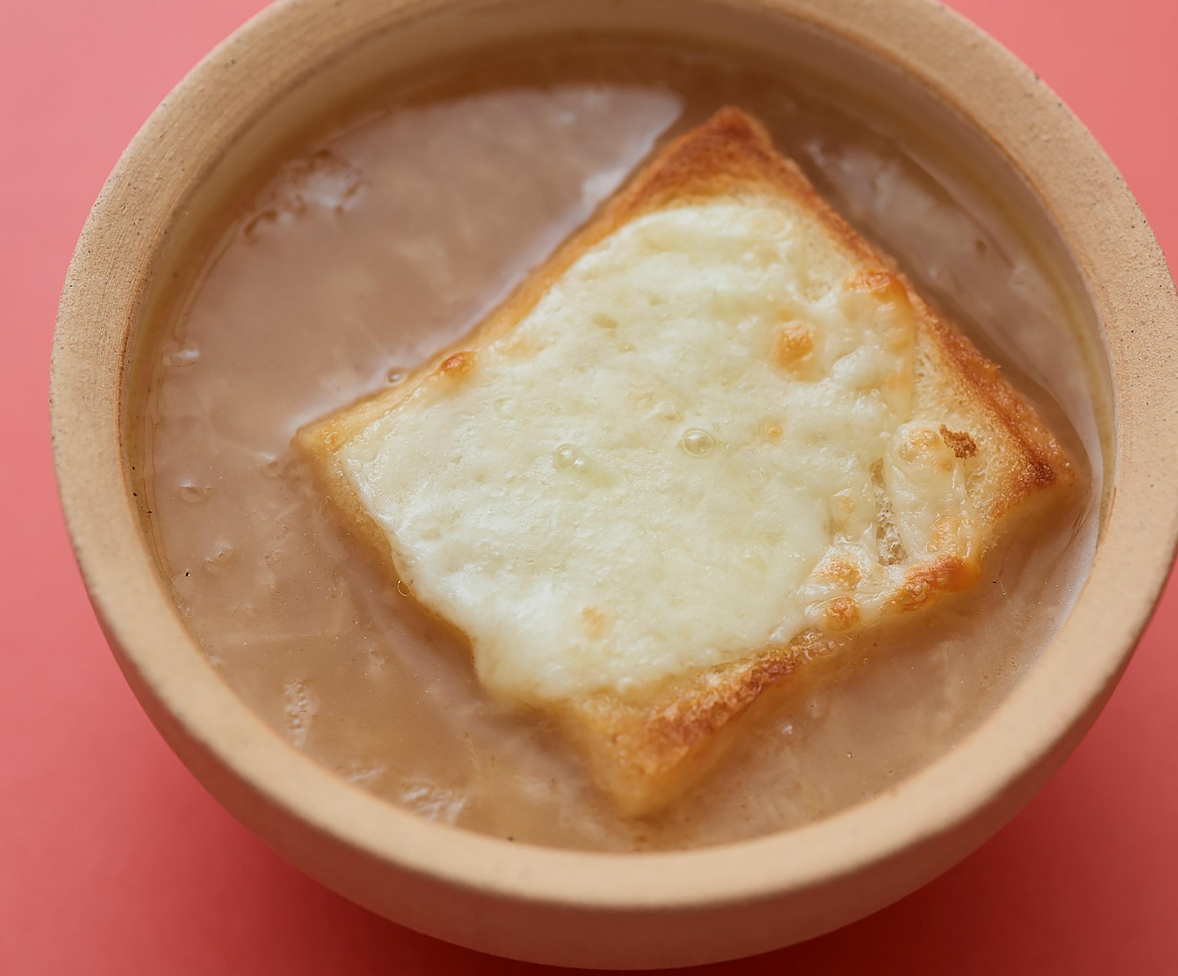 グラタン仕立てにしなくても、色づいた玉ねぎのコクが味わえる、食べごたえのあるスープができますよ。うすく切ってトーストしたパンをのせれば、簡単ながら満足感のある一食です。