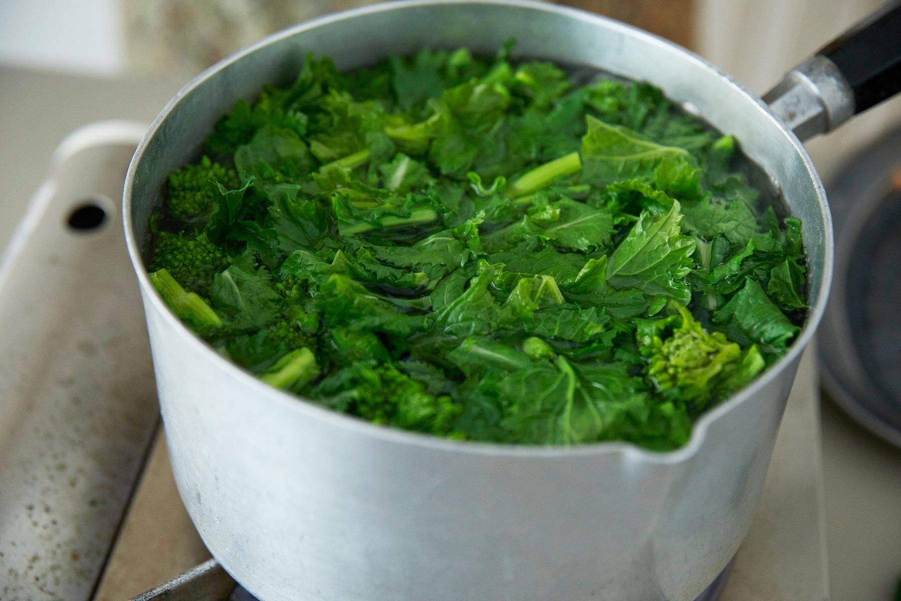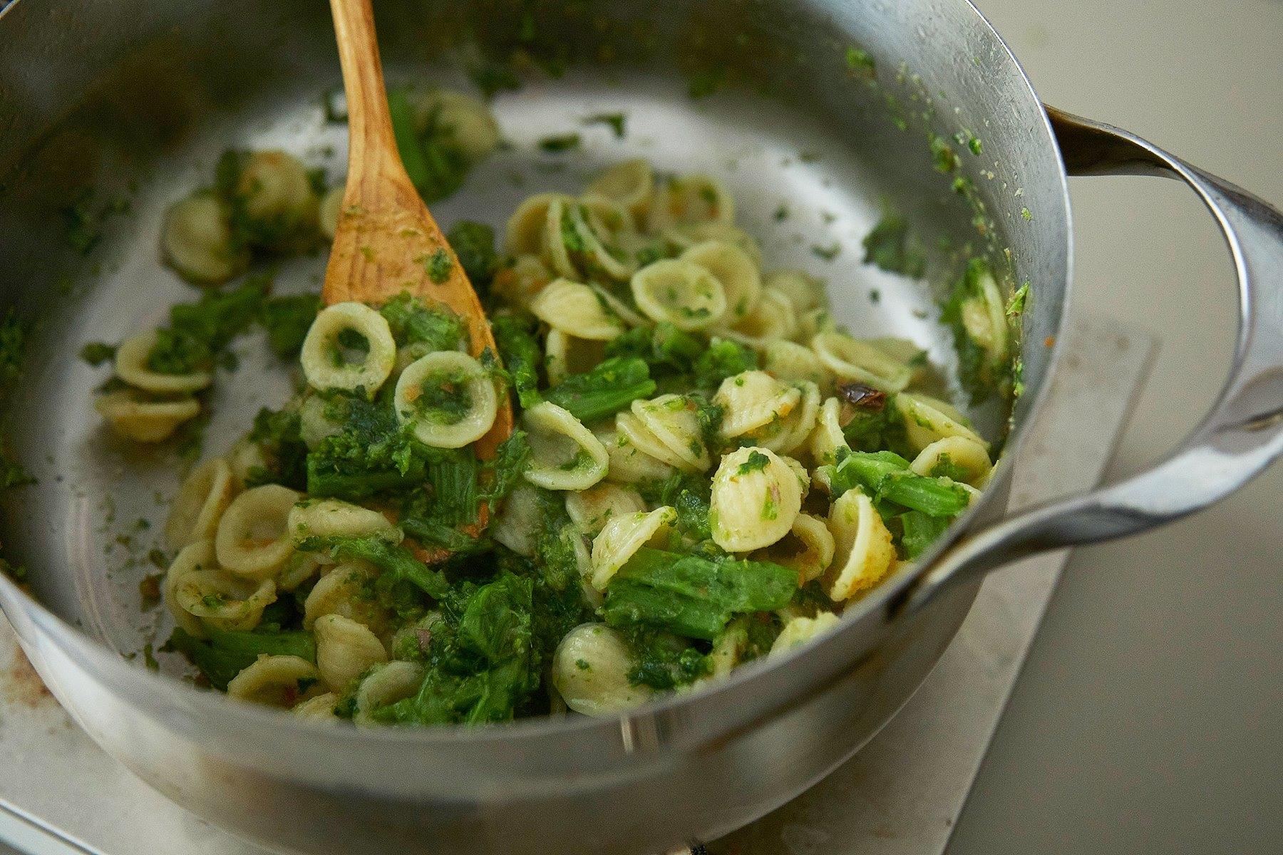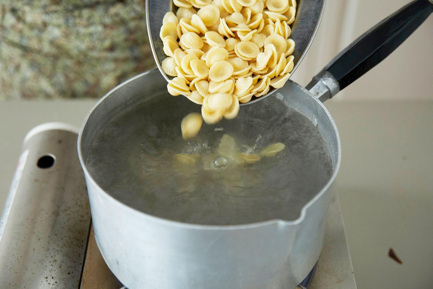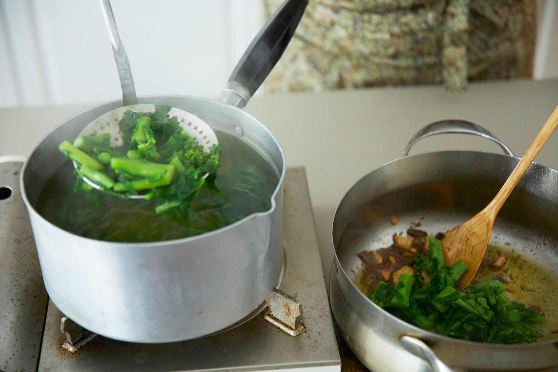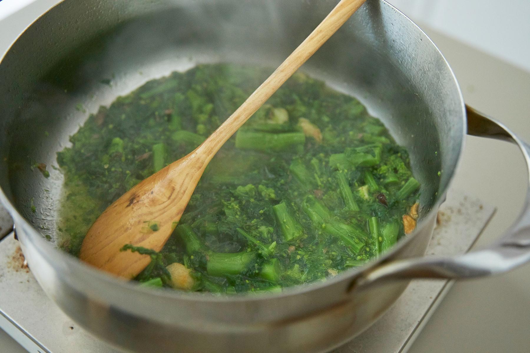 菜の花とオレキエッテを同じ鍋に入れ、菜の花は8分、オレキエッテは袋に表示されている時間ゆでる。パスタ同士がくっつかないように、ゆでている途中で全体を混ぜる。