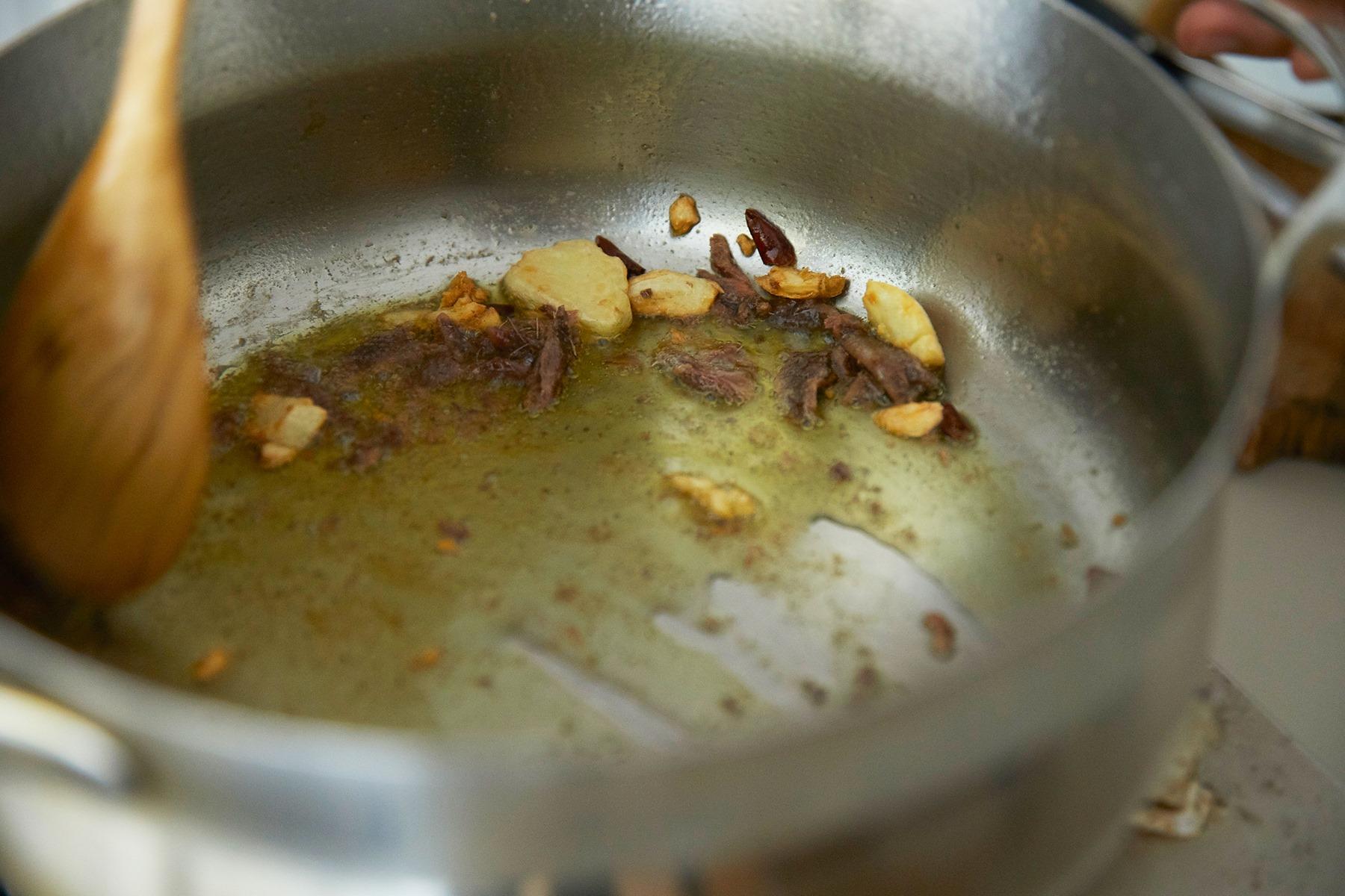 菜の花とパスタをゆでている時間を使って、皮を剥いてつぶしたにんにくと、オリーブオイルをフライパンに入れて弱火にかける。にんにくが茶色く色づいたらアンチョビと赤唐辛子を加えて、30秒ほど炒め合わせる。