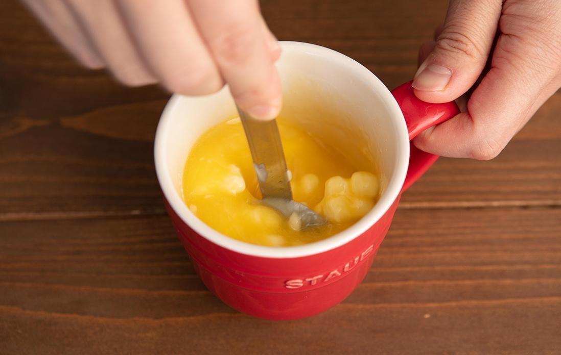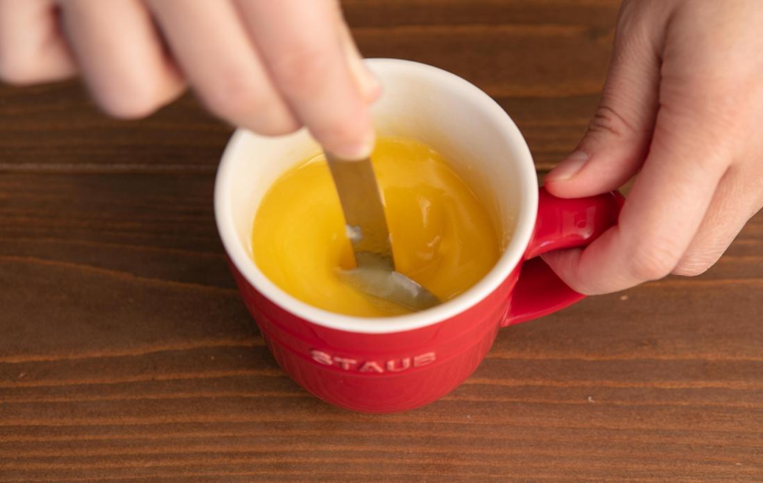 マグカップに卵を割り入れ、グラニュー糖を加えて混ぜ合わせる。