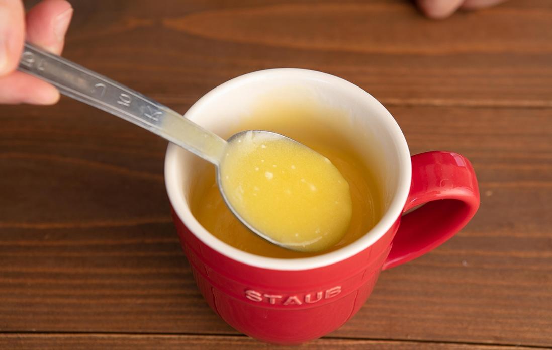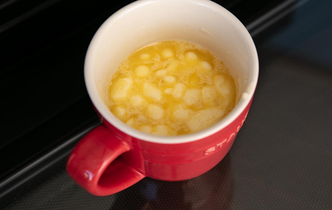 600Wの電子レンジで1分加熱する。取り出して、大さじでぐるぐると50回混ぜる。再びレンジで30秒ほど温めて取り出し、50回混ぜ合わせるプロセスを3回繰り返したらでき上がり。