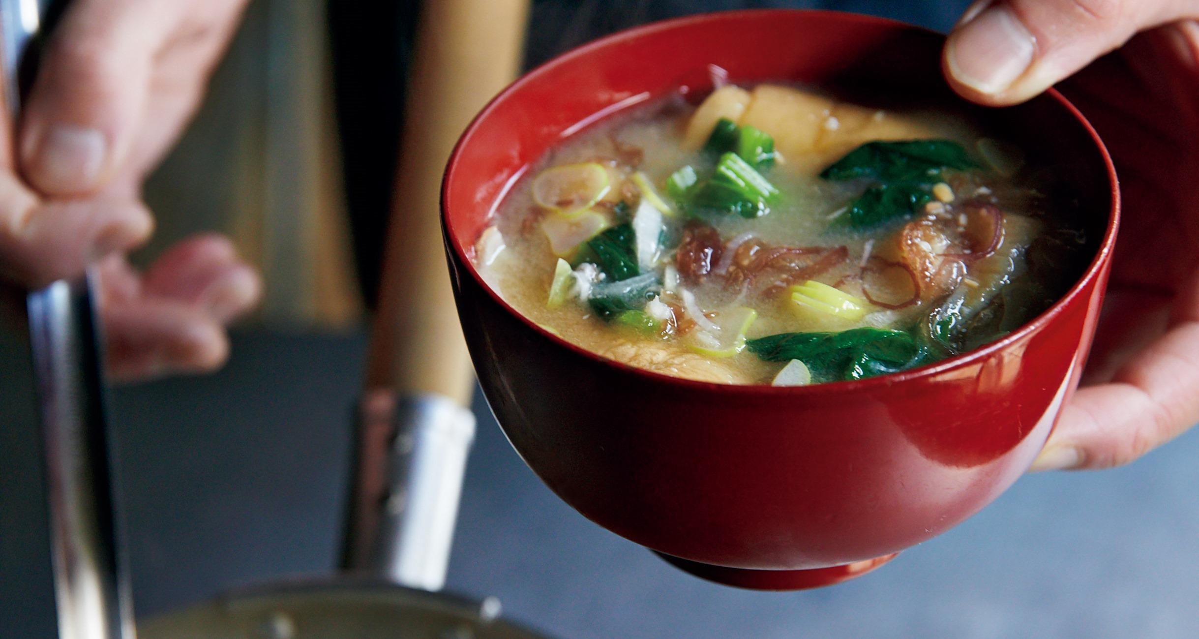 3を中火にかける。沸騰したら火を止めてアクを取り、味噌を入れる。ダマが残らないよう、泡立て器でしっかりと溶く。具を、布海苔、庄内麸、小松菜の順に入れる。庄内麸は、食べやすい大きさになるよう、手で割りながら入れる。最後に、小口切りにしたねぎをたっぷり入れ、再び火にかける。