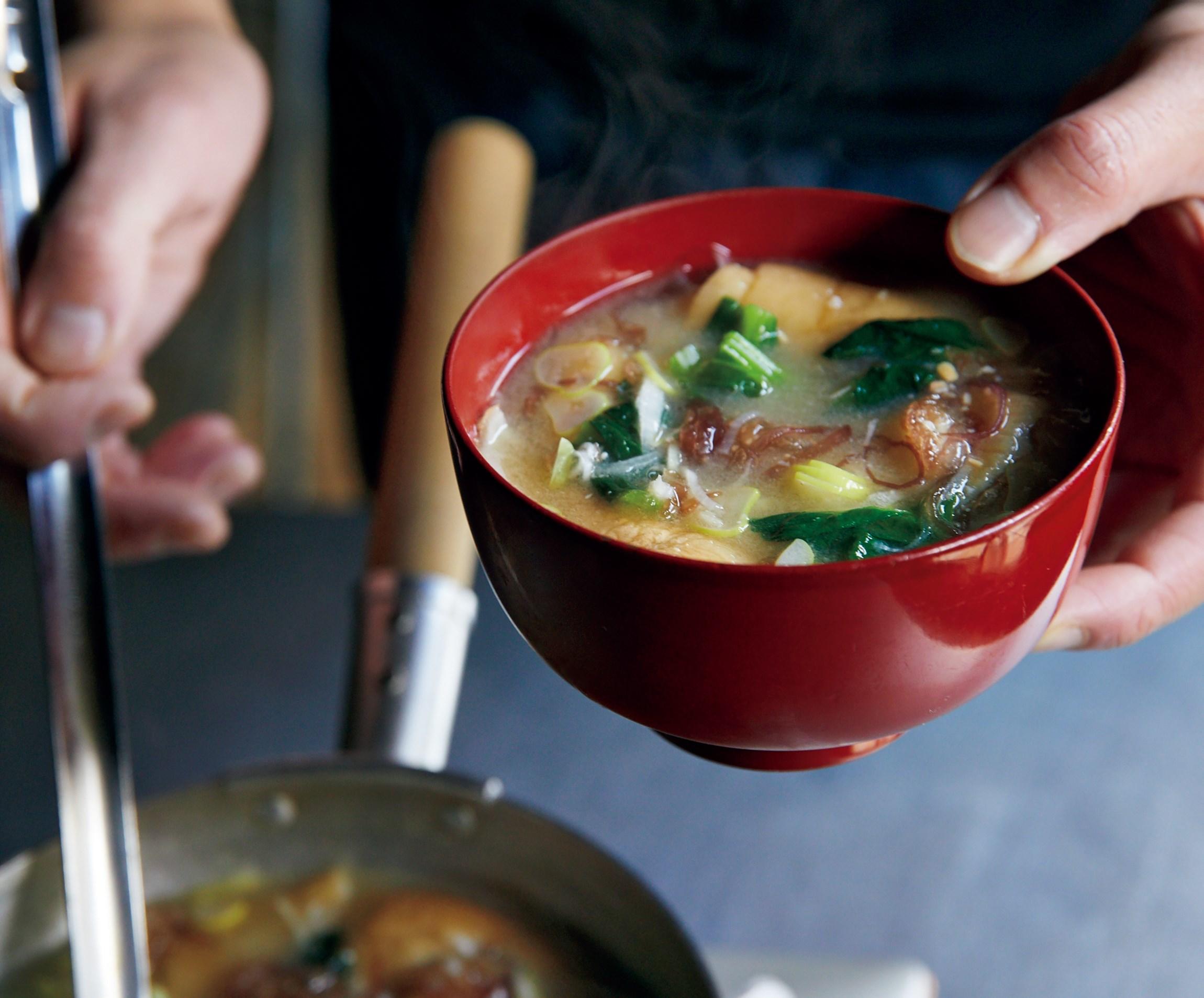 山食堂のみそ汁は、布海苔が全体にとろみをもたせ、シャッキリした小松菜やねぎ、汁を吸った庄内麸もだんだんとなじんで椀の中で一体となっていく。ゆっくり心と体にしみる味わいだ。