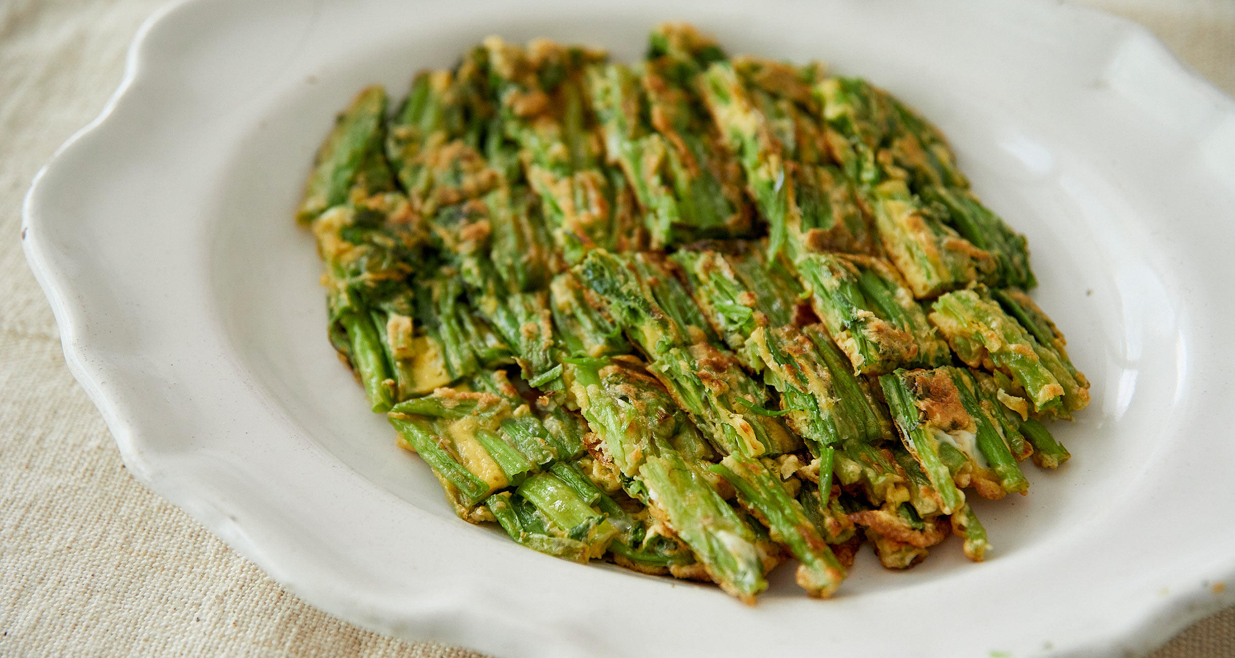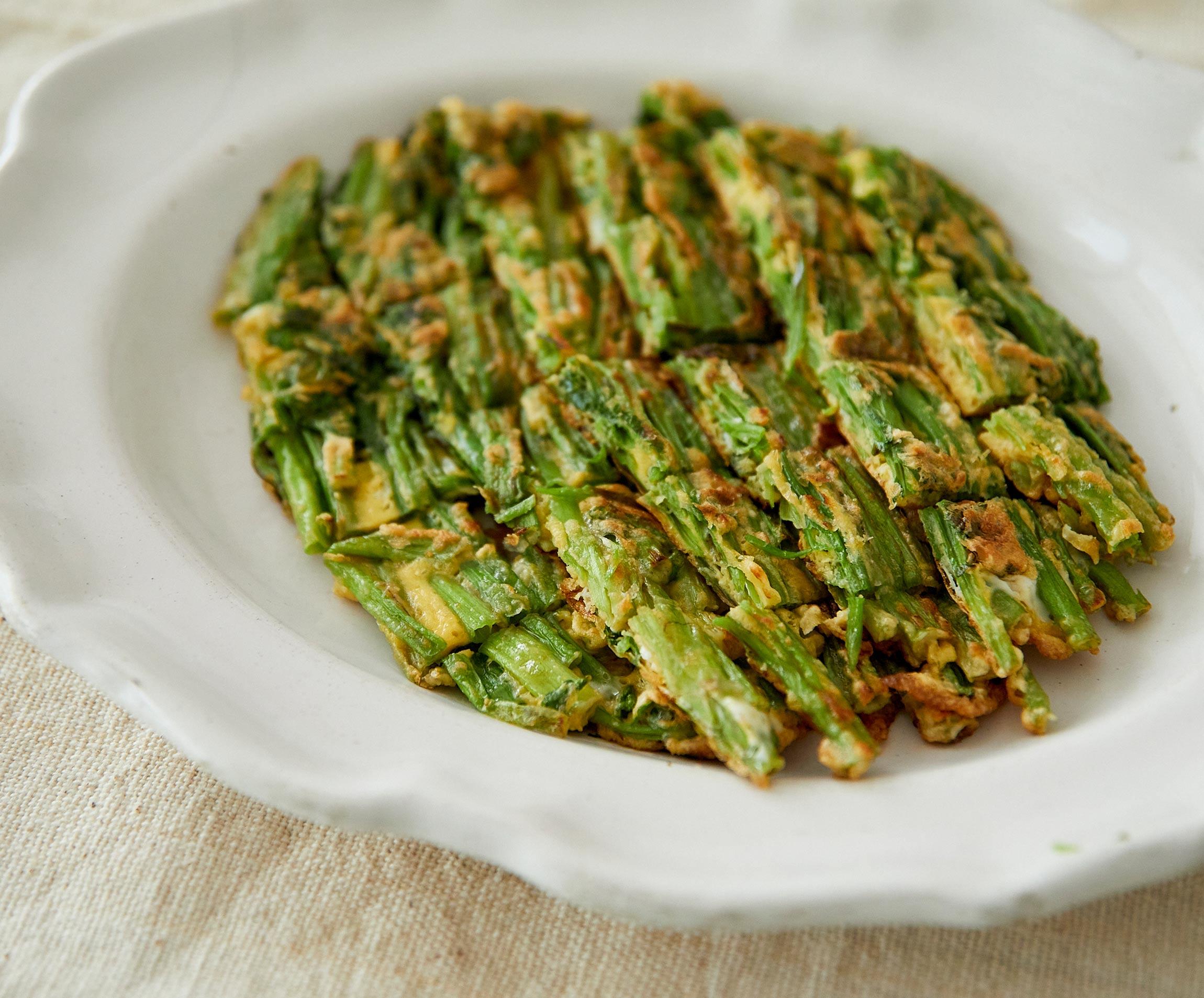 旬を迎えたセリは、柔らかい中にもシャキッとした食感が残る茎と、鼻に抜ける爽やかな香りが特徴です。それらを活かして、生地を纏わせて焼き上げるジョンをつくりましょう。具材はセリだけで、食べ応えたっぷりです。