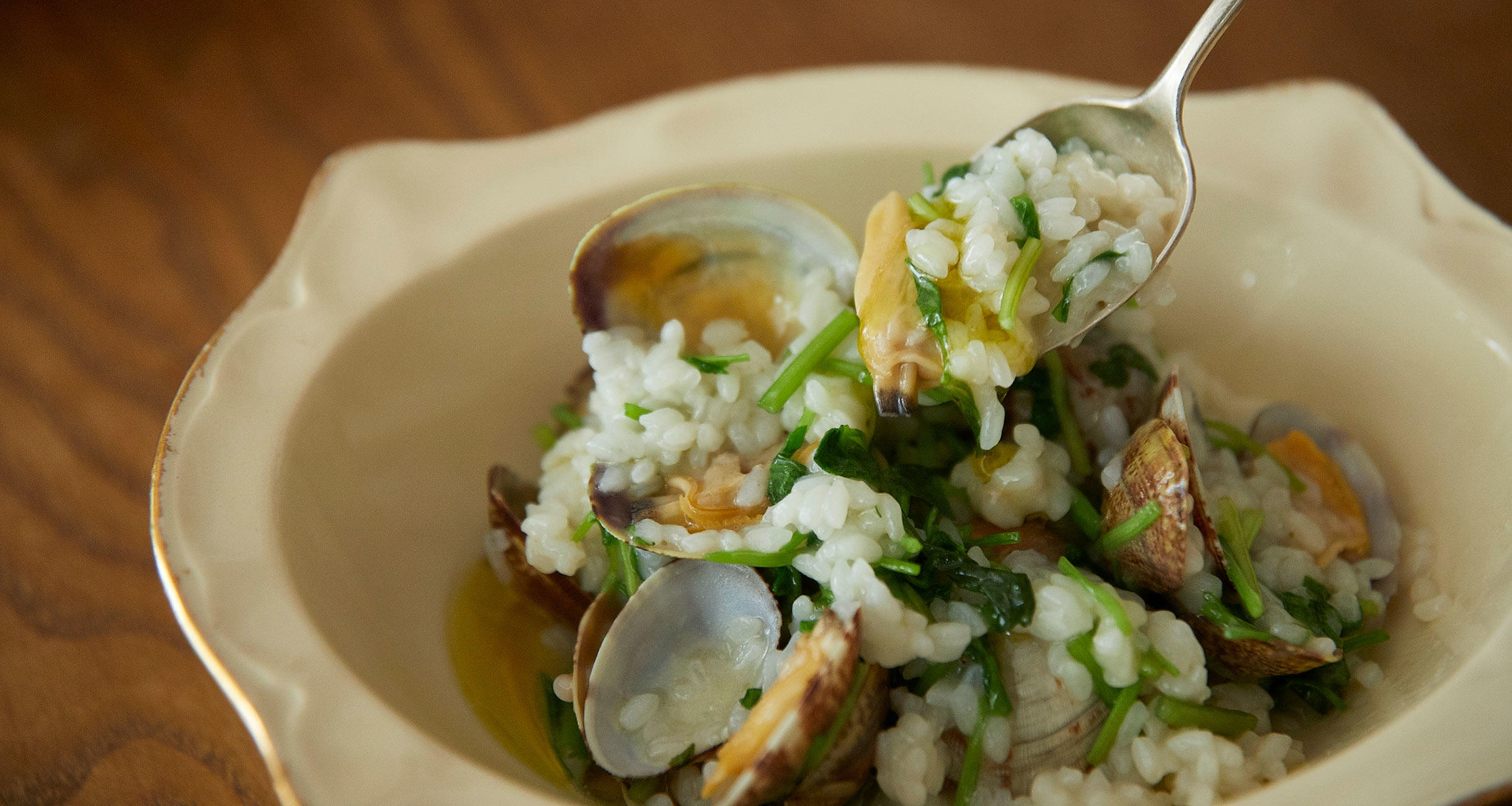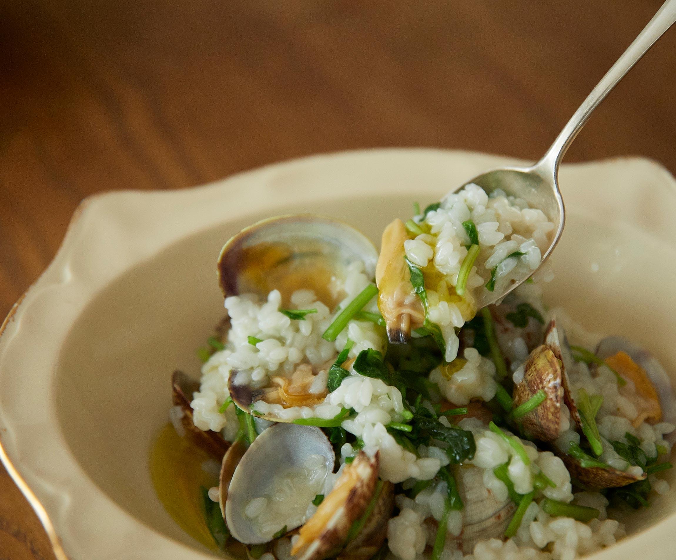 セリと同じく春に旬を迎えて、身がぷっくりしたあさりと組み合わせてみましょう。セリの香りとあさりの旨味を米に存分に吸わせてリゾットをつくります。