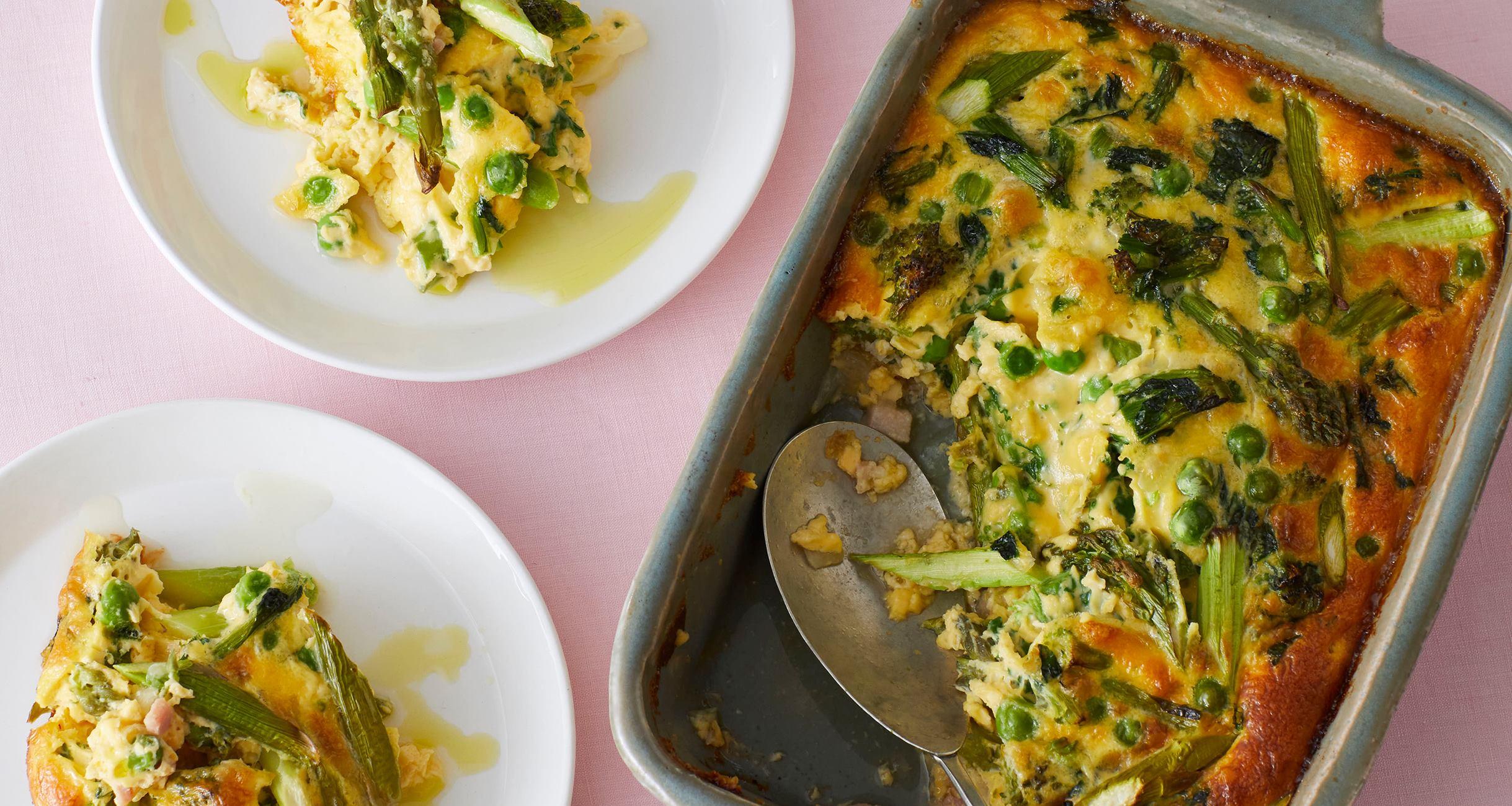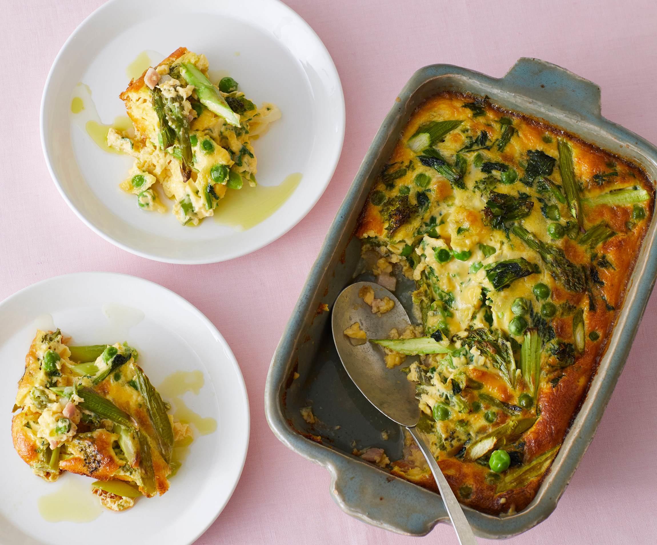 2の皿に3を敷き詰め、その上にアスパラと菜の花、グリーンピースを均等に散らし、卵液を流し入れる。