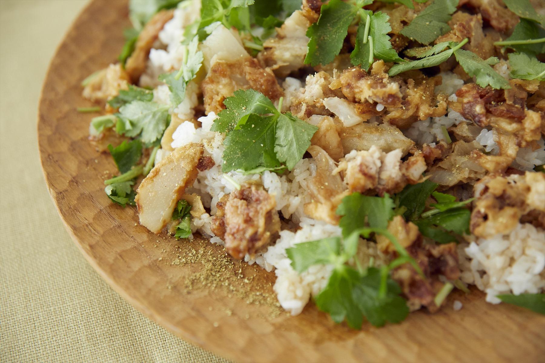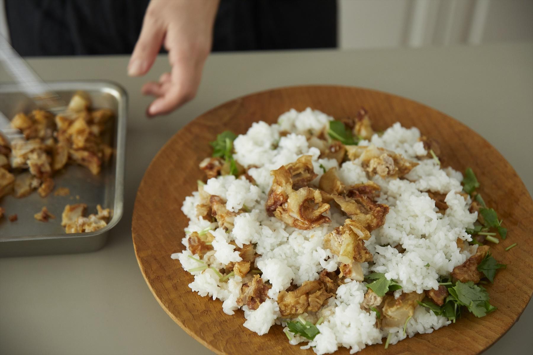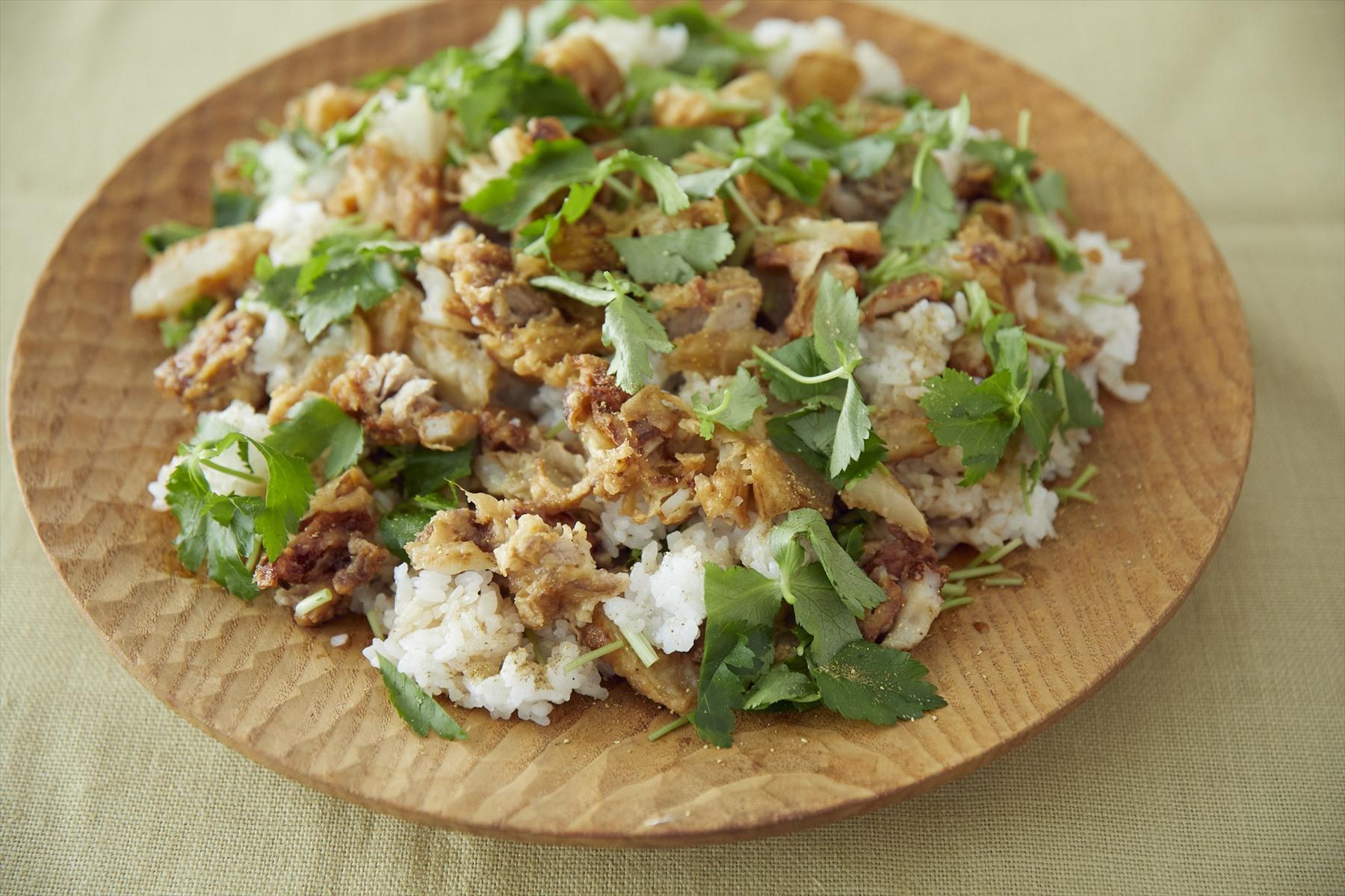 「山ウドと豚肉の天むす風ごはん」と名付けましたが、天むすよりも多くの具材と一緒に、適度に甘辛だれが染みたごはん