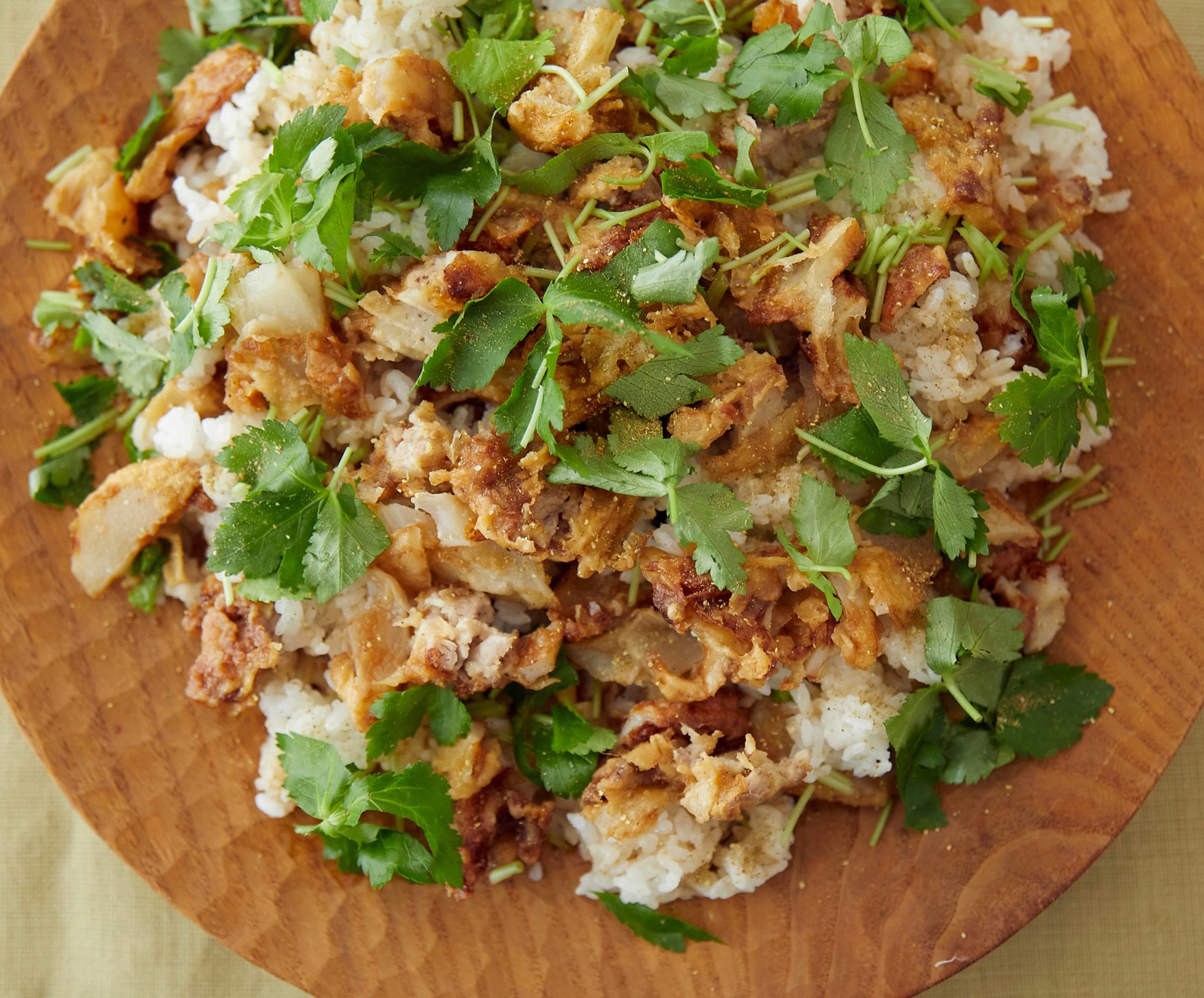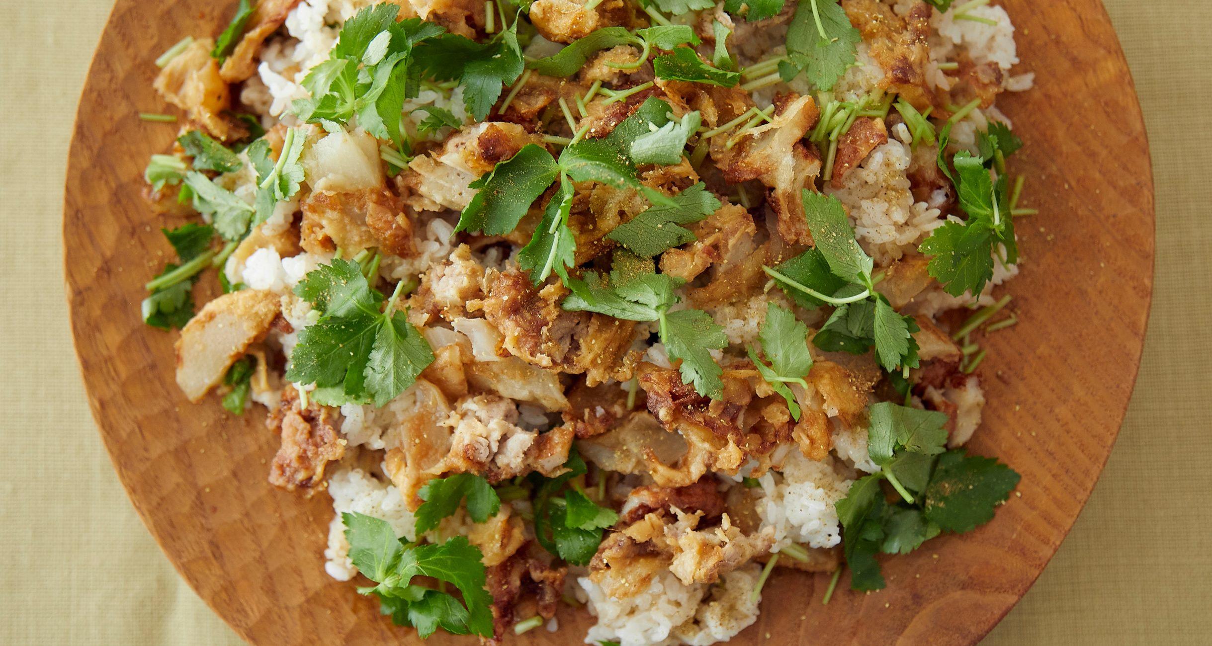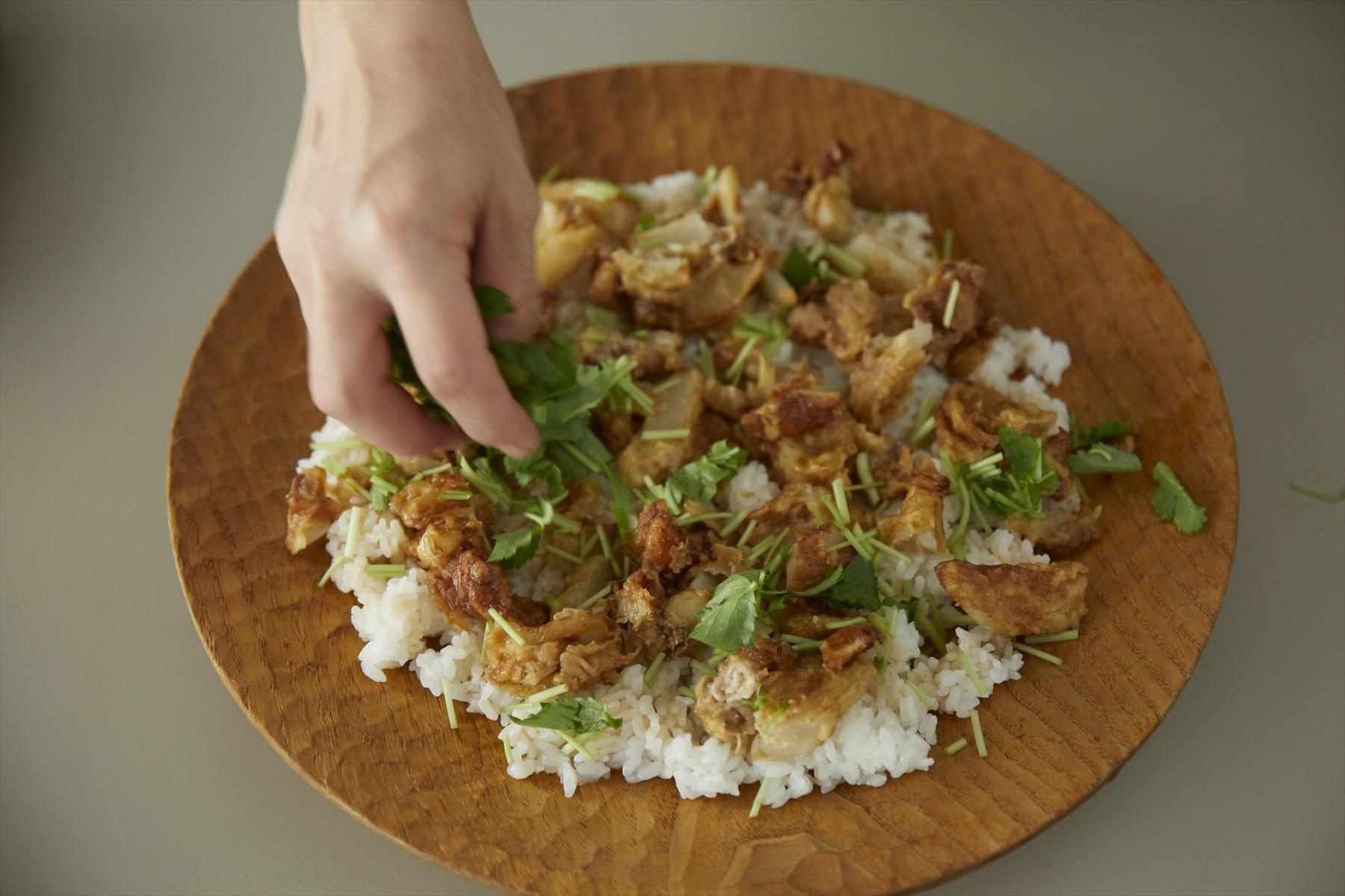 「山ウドと豚肉の天むす風ごはん」と名付けましたが、天むすよりも多くの具材と一緒に、適度に甘辛だれが染みたごはん