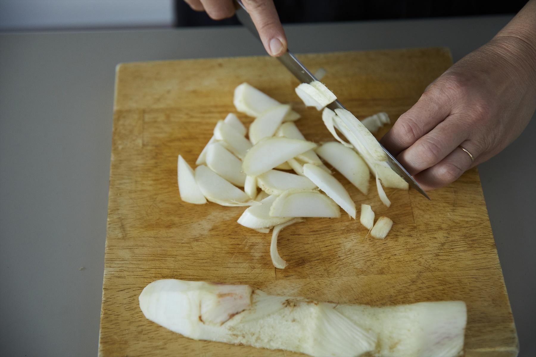 ウドは皮付きのまま縦半分に切った後、厚さ3~5mmの斜めうす切りにする。