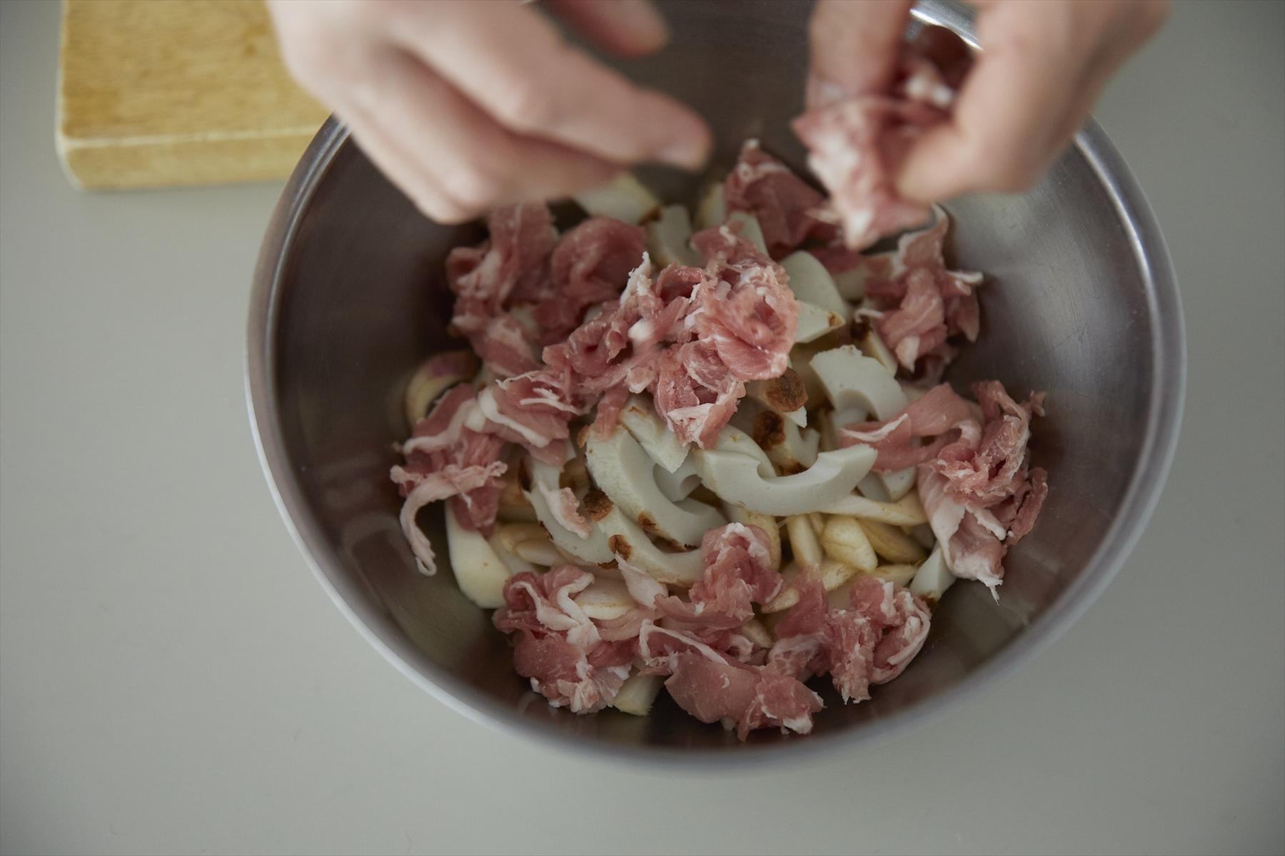 ちくわもウドと同じ大きさに切り、豚肉は2cm幅に切ってほぐしておく。