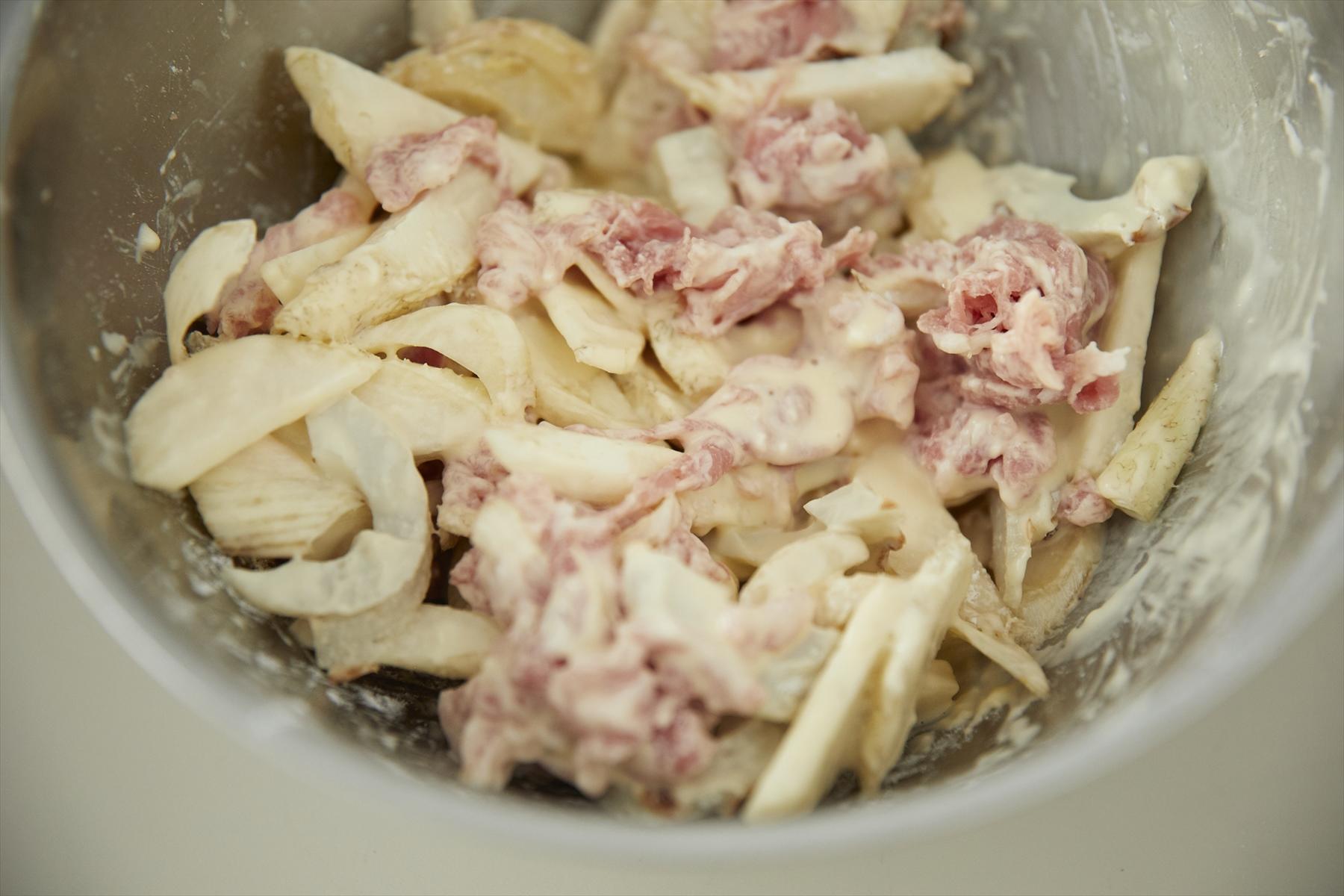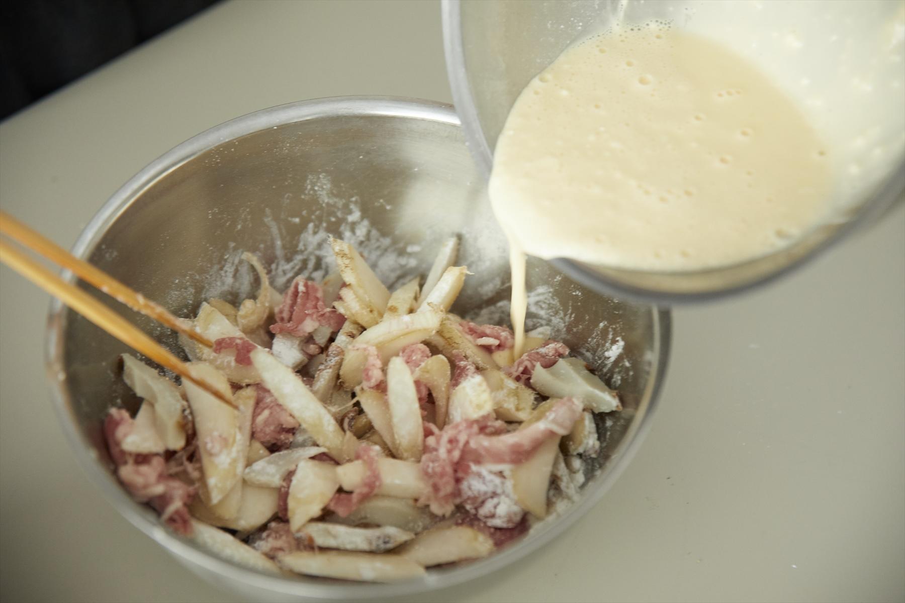 大きめのボウルに2をすべて入れ、薄力粉大さじ1~2をまぶす。別のボウルに溶き卵と冷水、薄力粉1/2カップを合わせて、2の具材同士がくっつくようになるまで混ぜ合わせる。