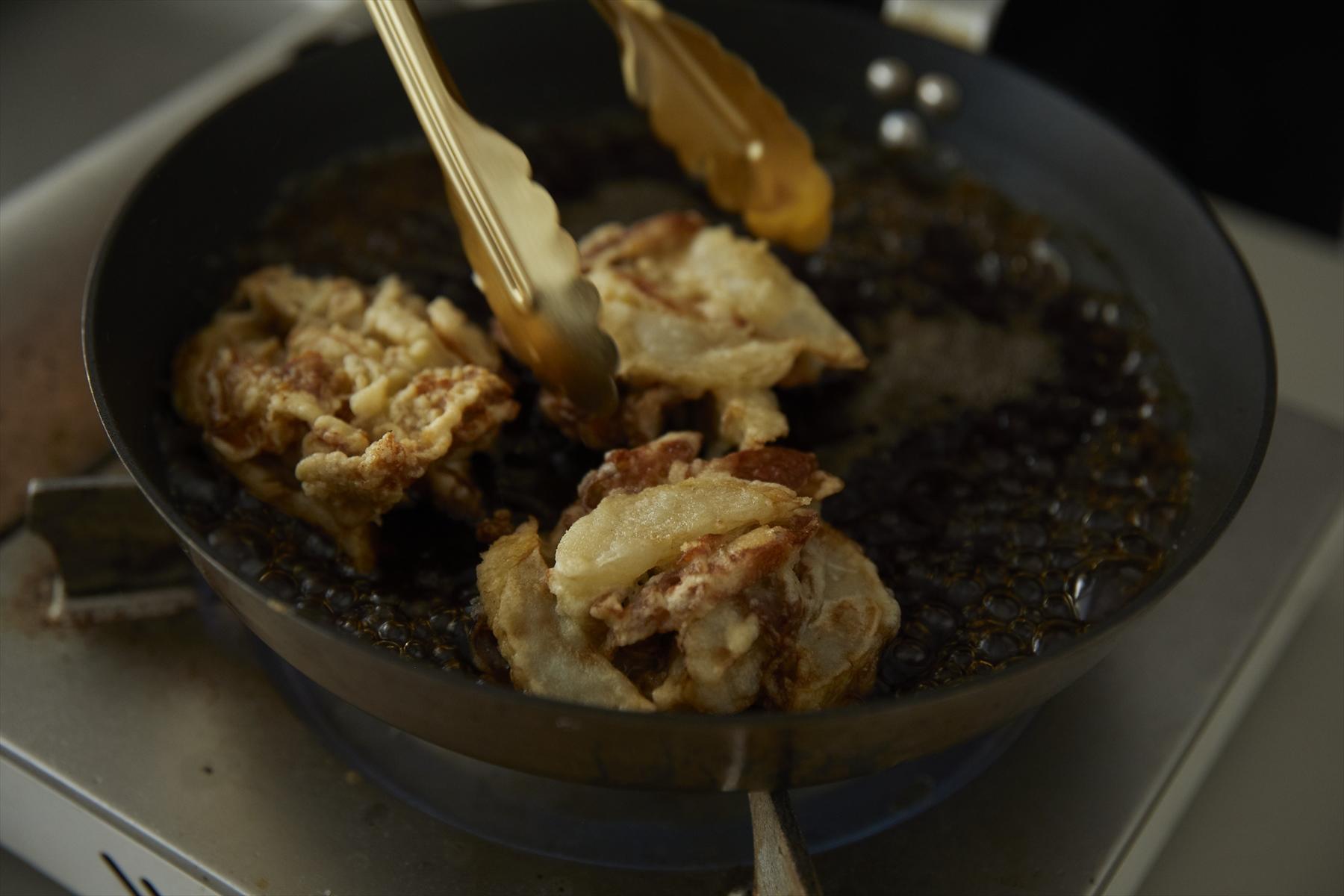 フライパンでめんつゆを熱して、半分くらいの量まで煮詰まったら、4を加えて煮からめる。かき揚げをバットや大きな皿に取り出して、キッチンバサミなどで2cmほどの大きさに細かく刻む。フライパンに残っためんつゆは仕上げの味付けで使うので、おいておく。