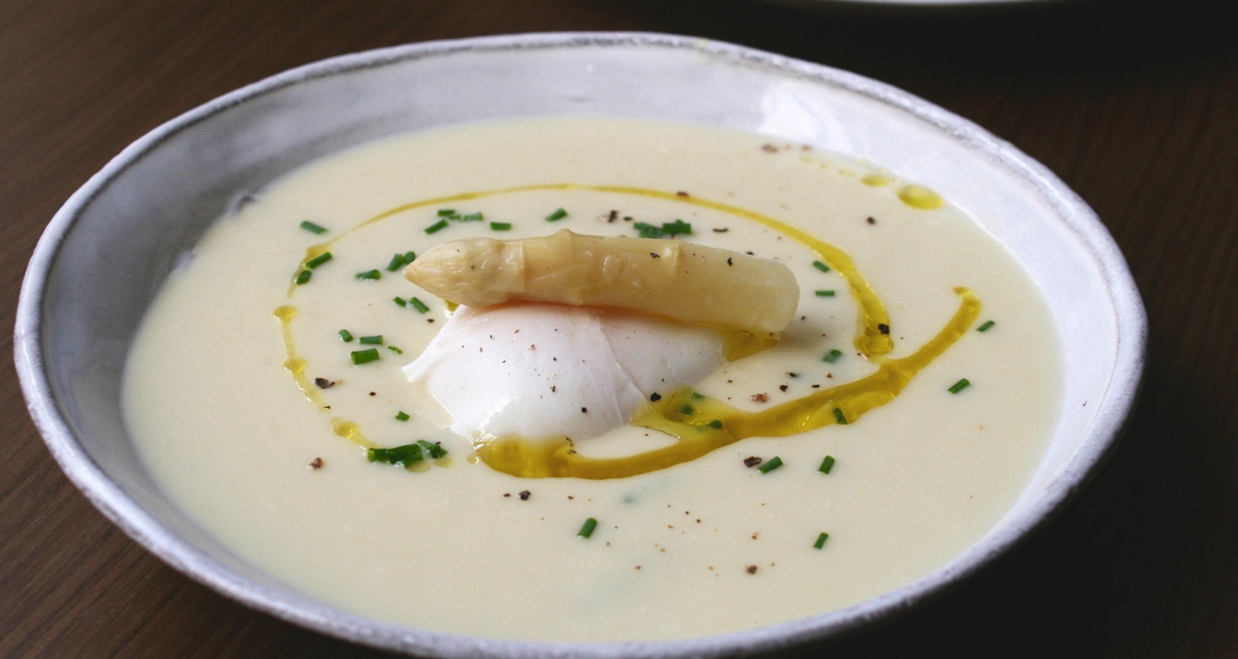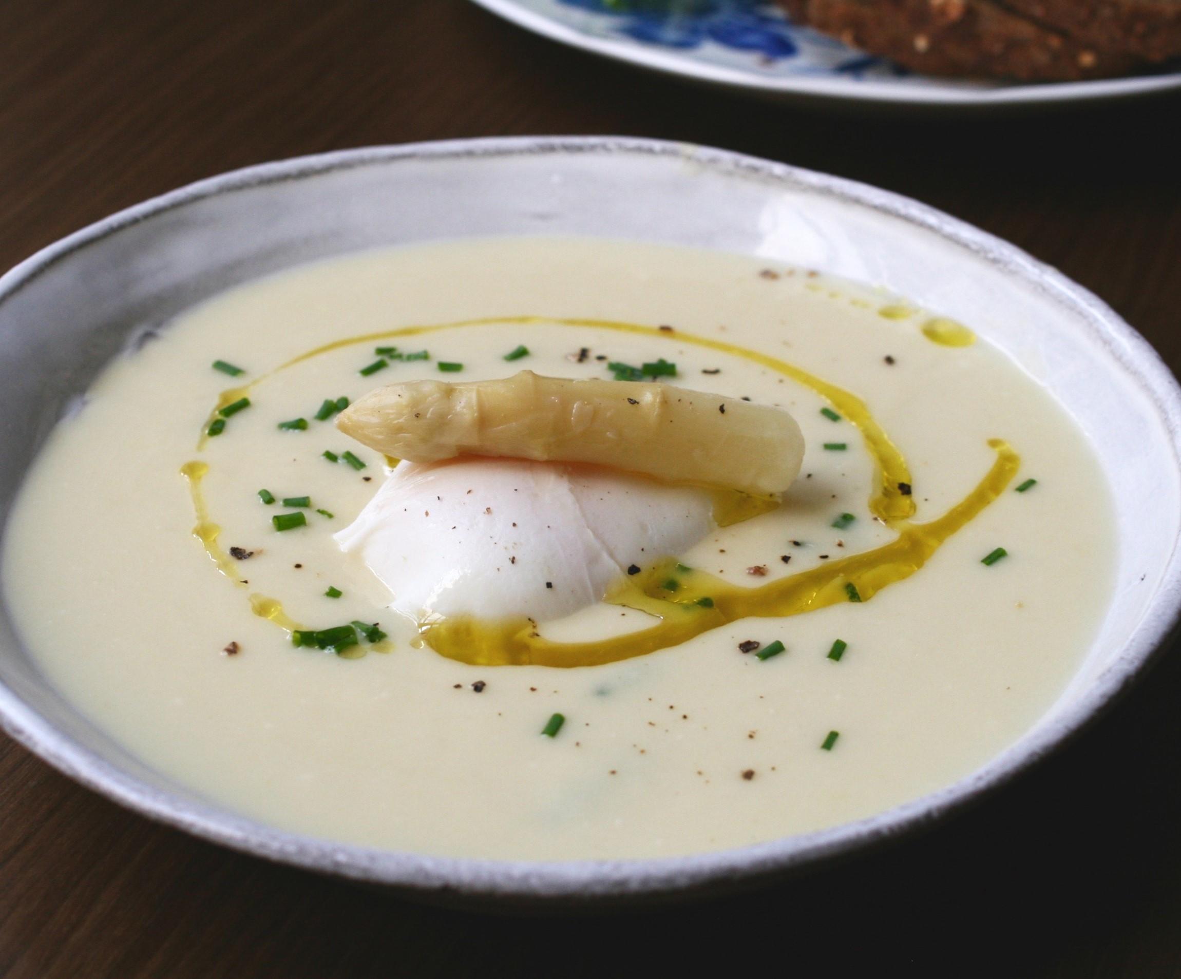 浅めのお皿にスープを盛り、ポーチドエッグ(分量外)を中央に置き、シブレット(分量外)、粗挽き黒胡椒、オリーブオイル(分量外)などをかければ完成となります。冒頭で述べましたように、「スープを食べる」と言う意味がよくわかる仕上がりになっていますよ。ブイヨンを使わないので、ホワイトアスパラの風味が100パーセントそのまま濃縮されています。まろやかな甘さは他の野菜では味わえない繊細な旨味が充満していますが、その中にほろ苦さを感じるのがホワイトアスパラの特徴です。栄養豊富で、立派な一食となったホワイトアスパラのヴルーテをお愉しみください。